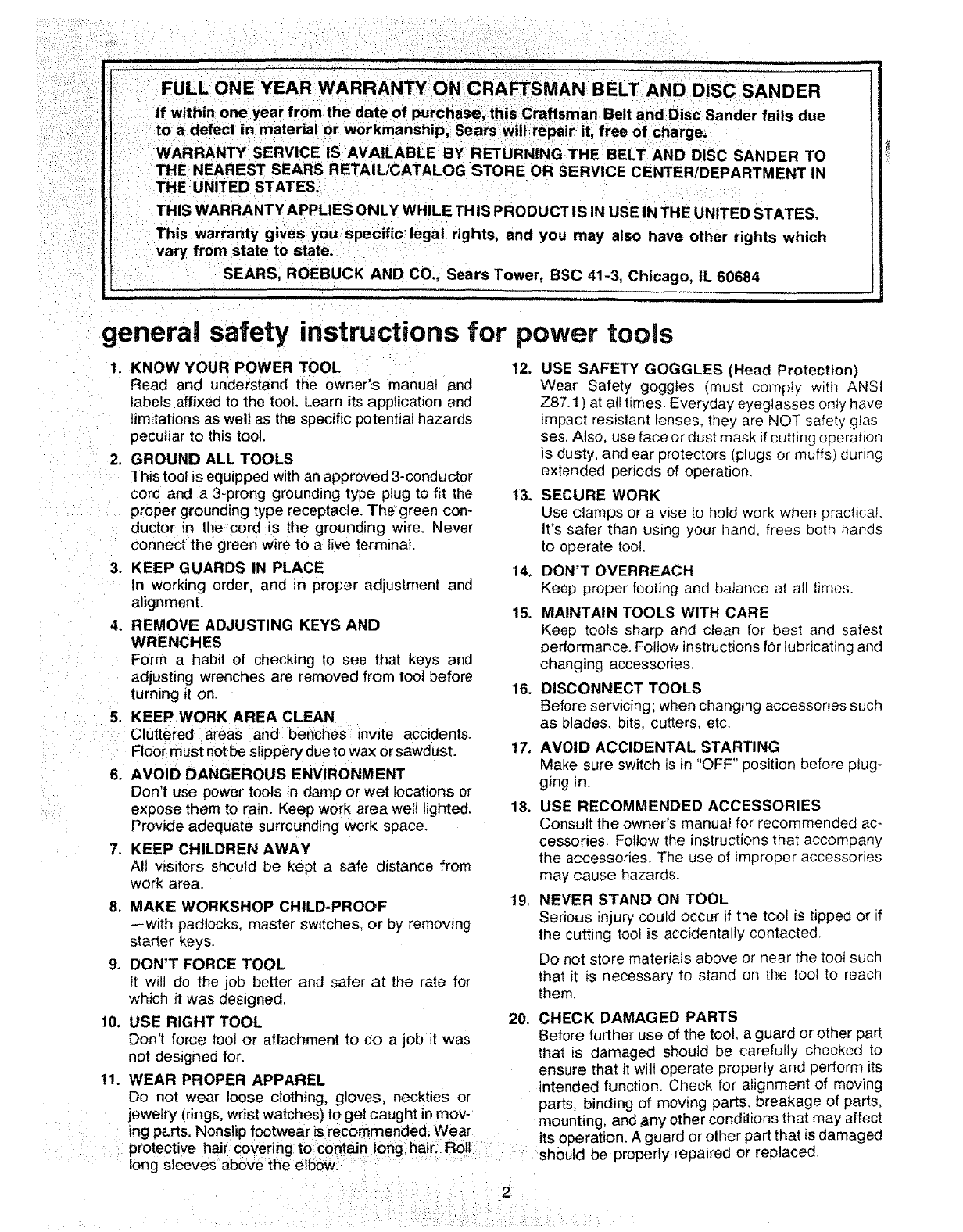 FULL ONE YEAR WARRANTY ON CRAFTSMAN BELT AND DISC SANDER