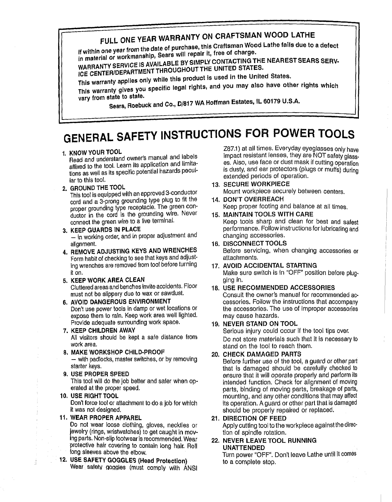 FULL ONE YEAR WARRANTY ON CRAFTSMAN WOOD LATHE