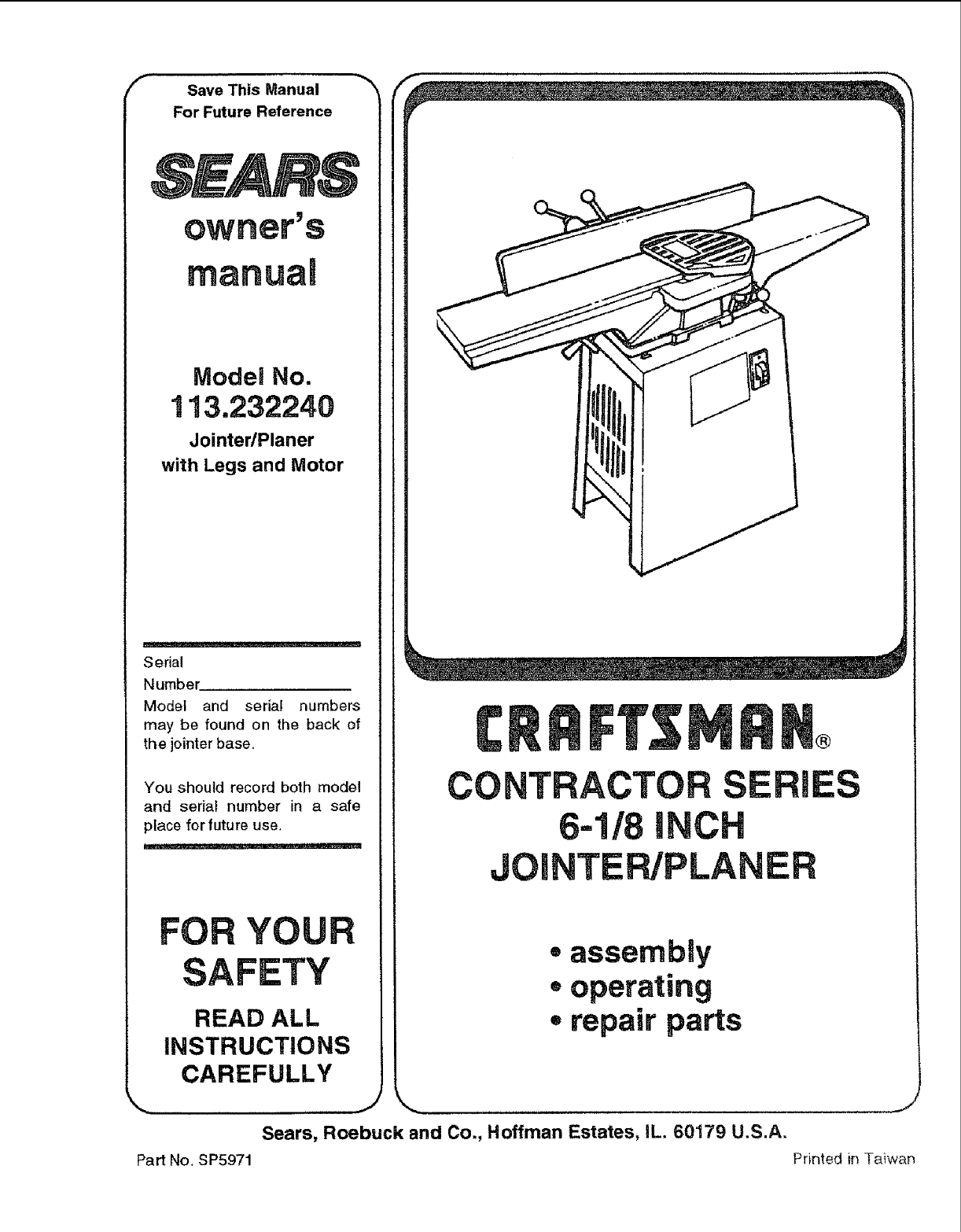 User Manual: Craftsman 113232240 113232240 CRAFTSMAN 6 1/8 INCH JOINTER/PLANER - Manuals and Guides View the owners manual for your CRAFTSMAN 6 1/8 INCH JOINTER/PLANER #113232240. Home:Tool Parts:Craftsman Parts:Craftsman 6 1/8 INCH JOINTER/PLANER Manual