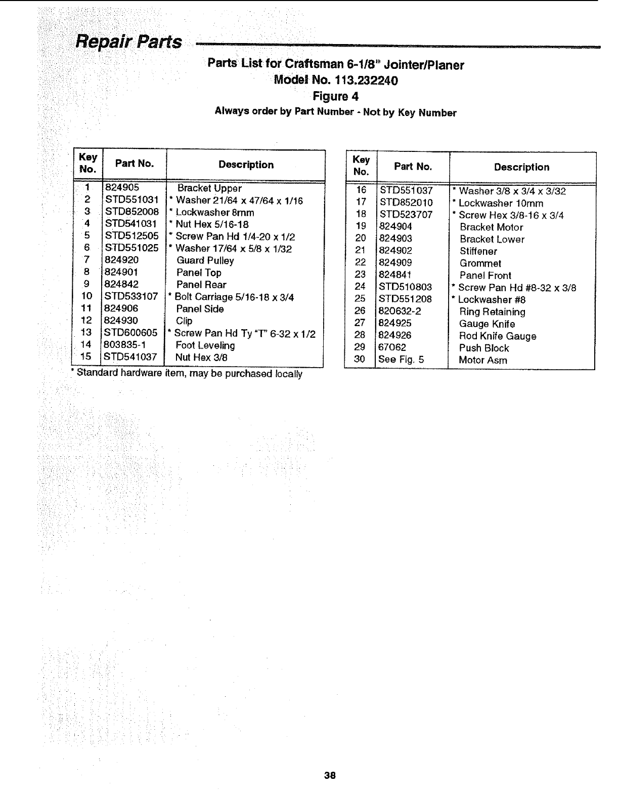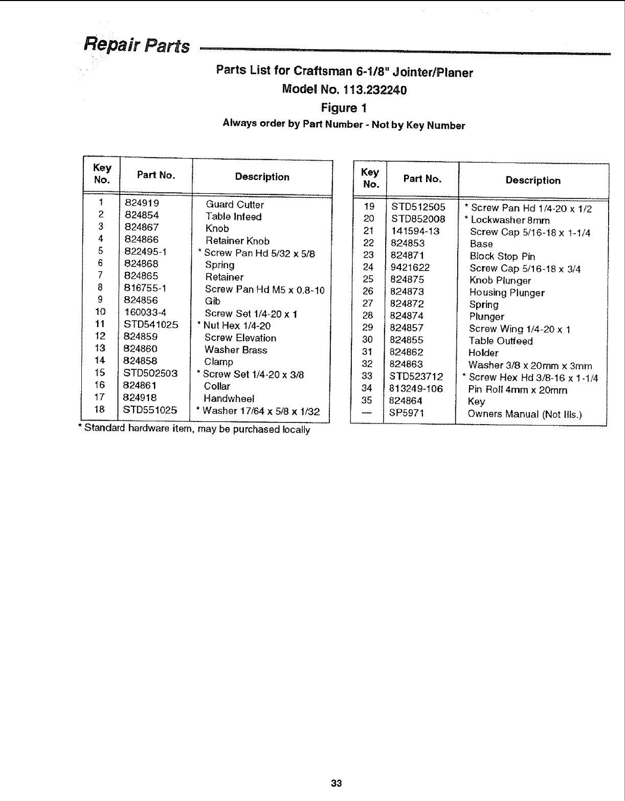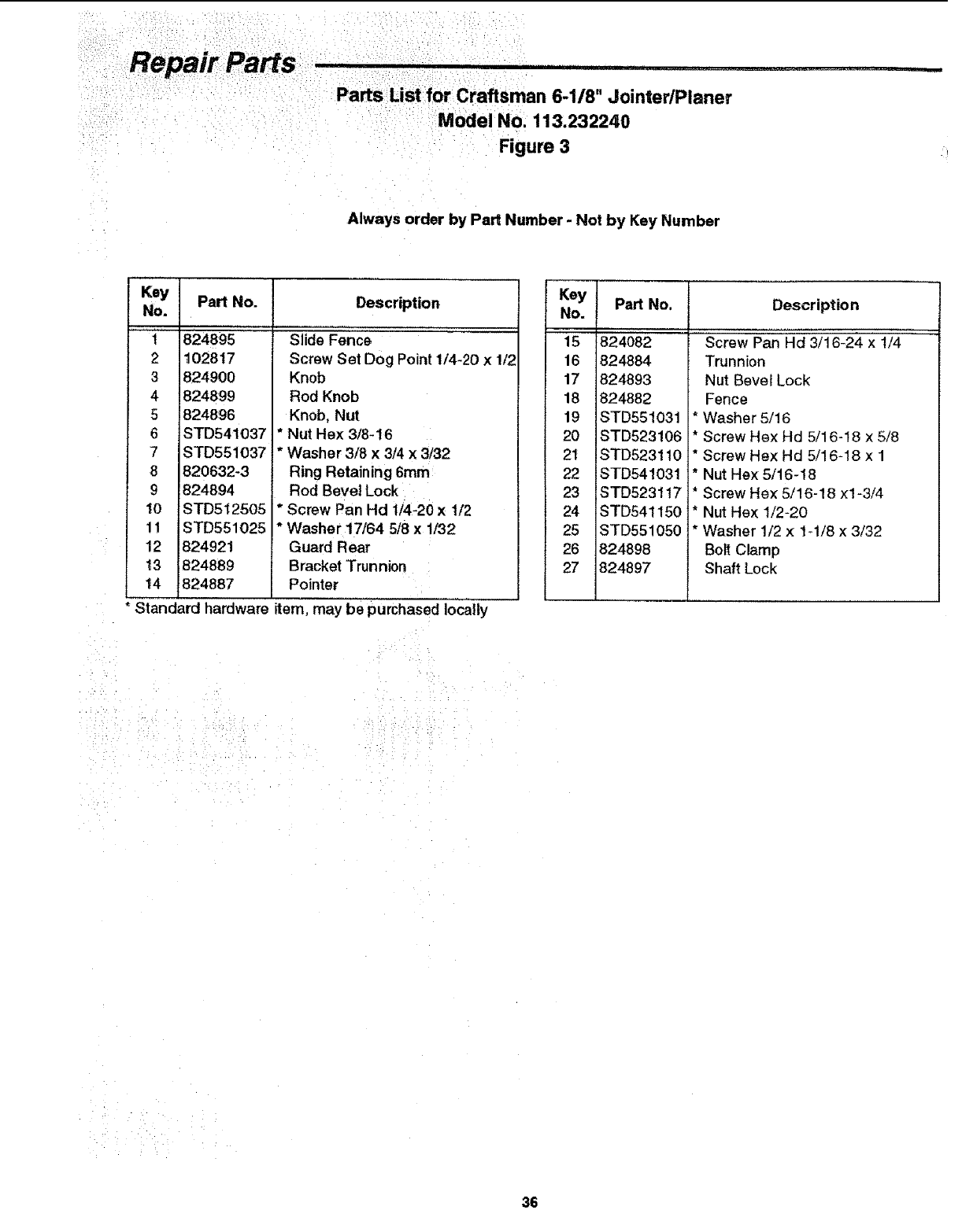 Parts List for Craftsman 6-118" JointedPlaner
