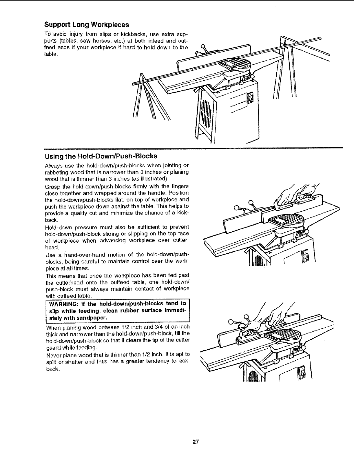 outfeed table, infeed table and hold-down/push-blocks. <_