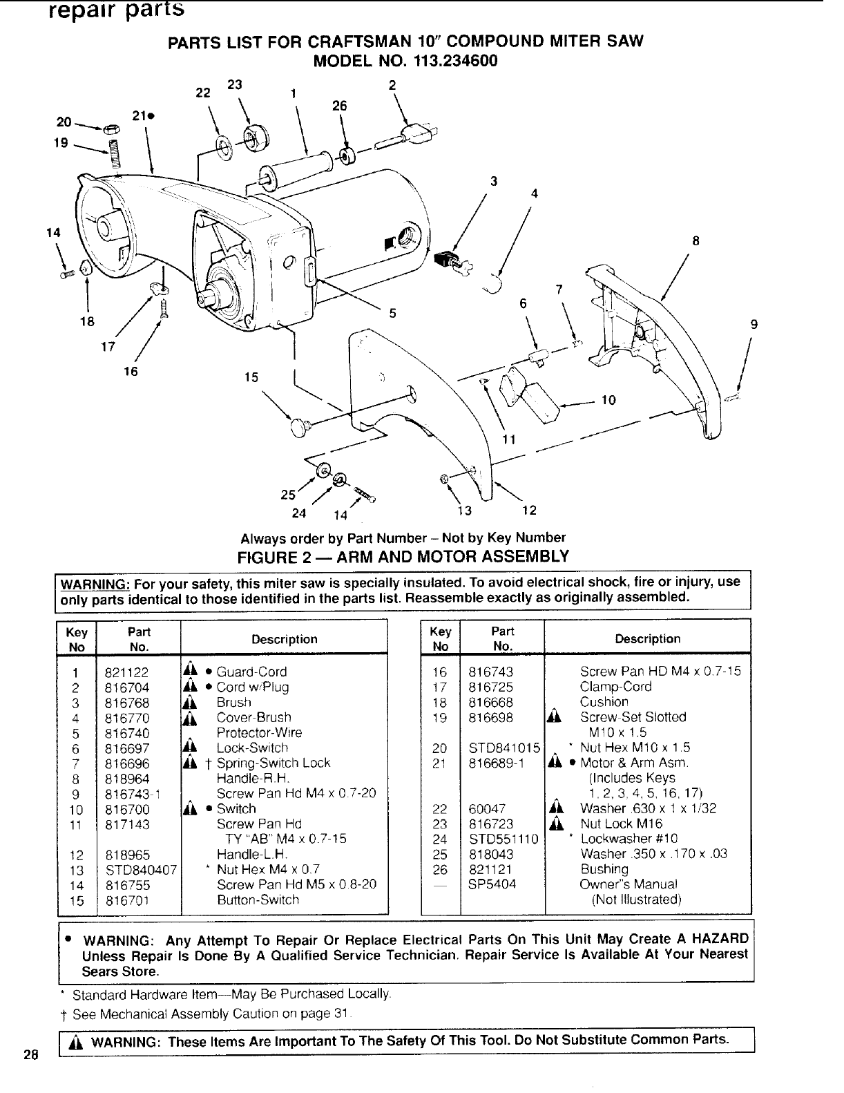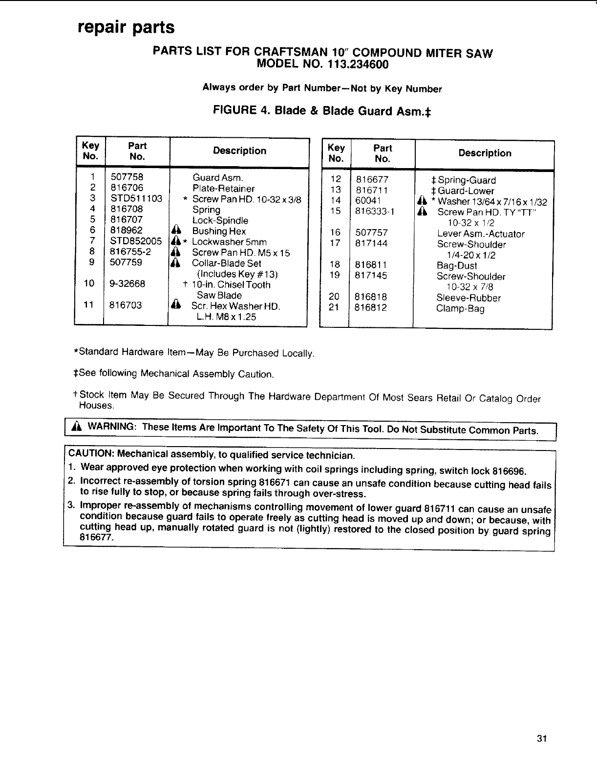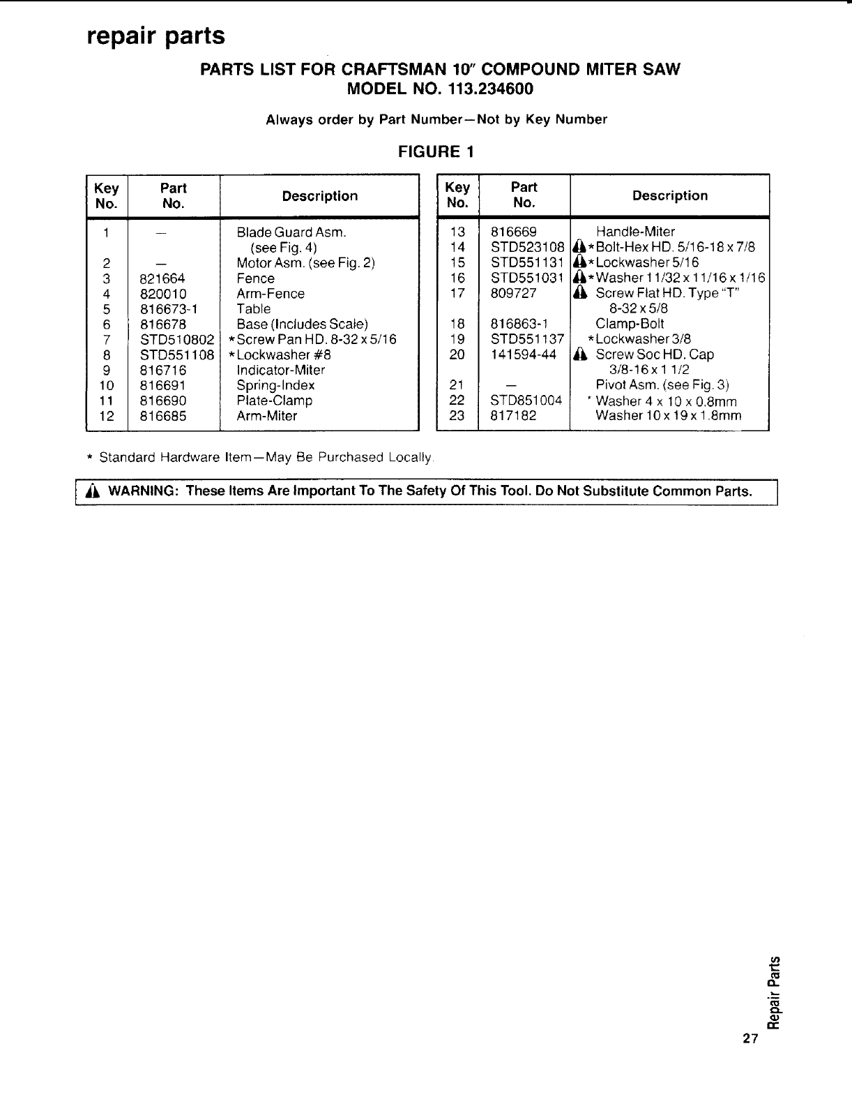 I_ WARNING: These Items Are Important To The Safety Of This Tool. Do Not Substitute Common Parts. I