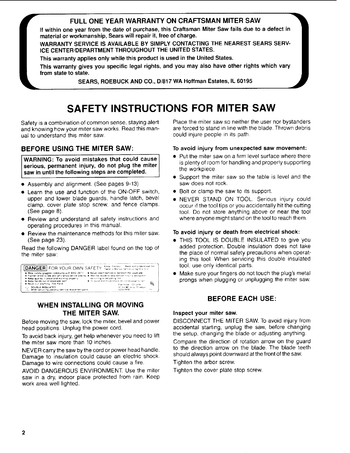 FULL ONE YEAR WARRANTY ON CRAFTSMAN MITER SAW