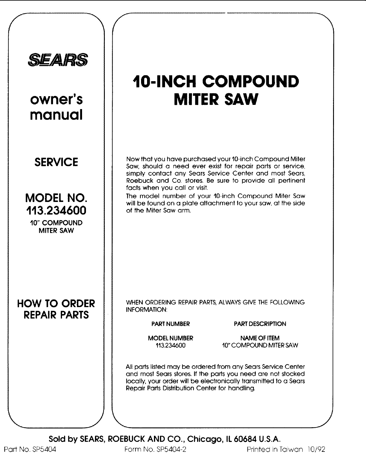 Part No. SP5404 Form No, SP5404-2 Printed in Taiwan 10/92