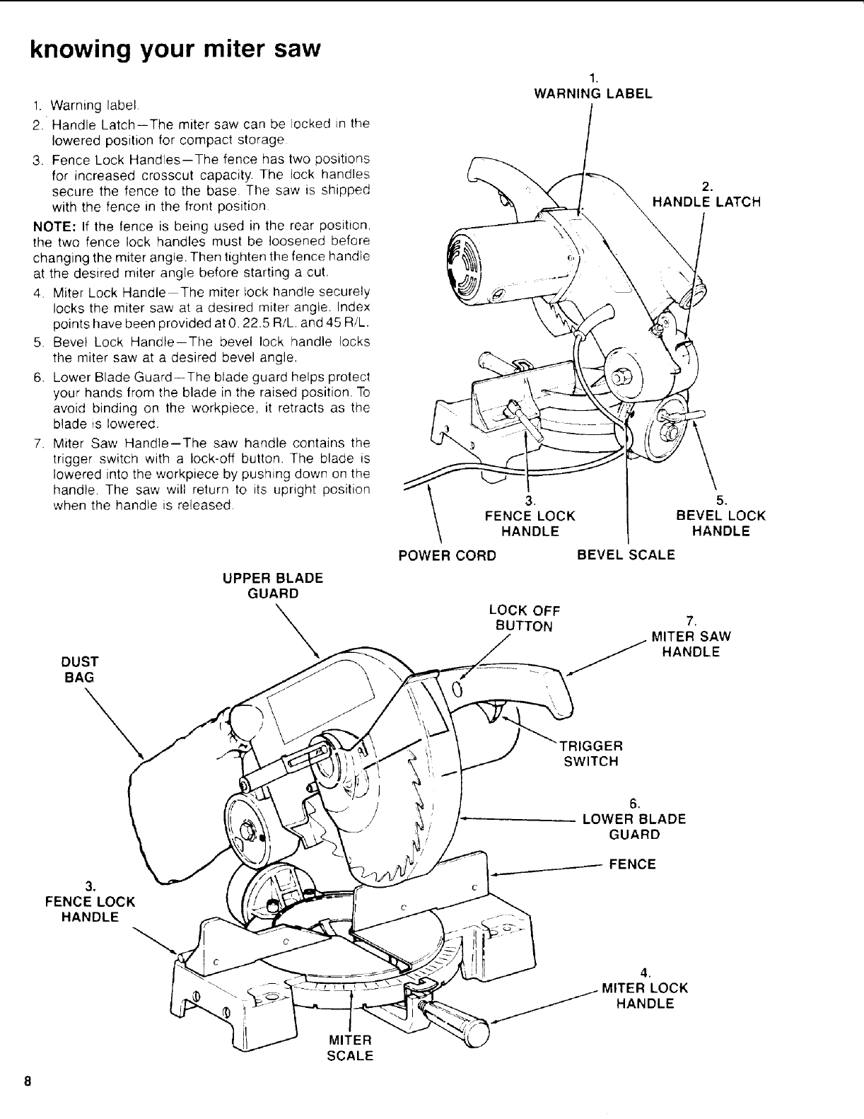 upper and lower blade guards, handle latch, bevel