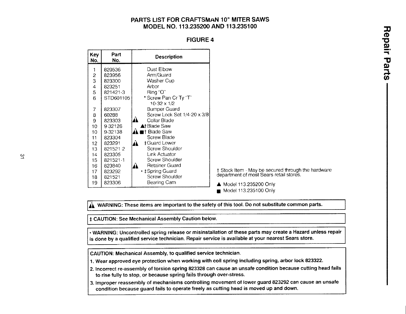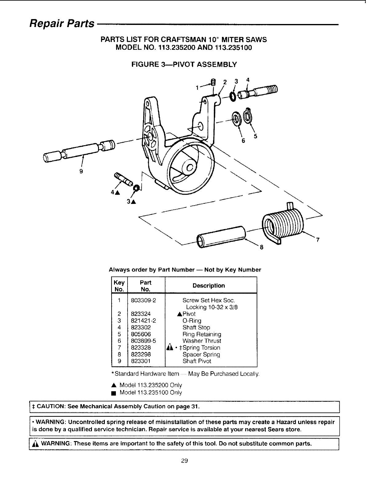 •WARNING: Uncontrolled spring release of misinstallation of these parts may create a Hazard unless repair