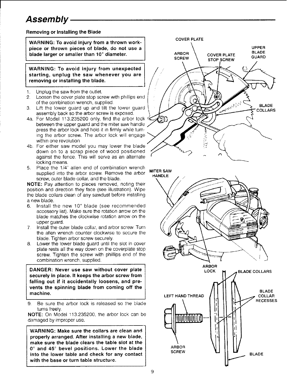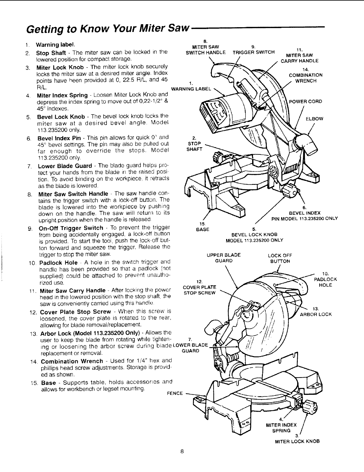 knob (Model 113.235200 only) and cover plate stop