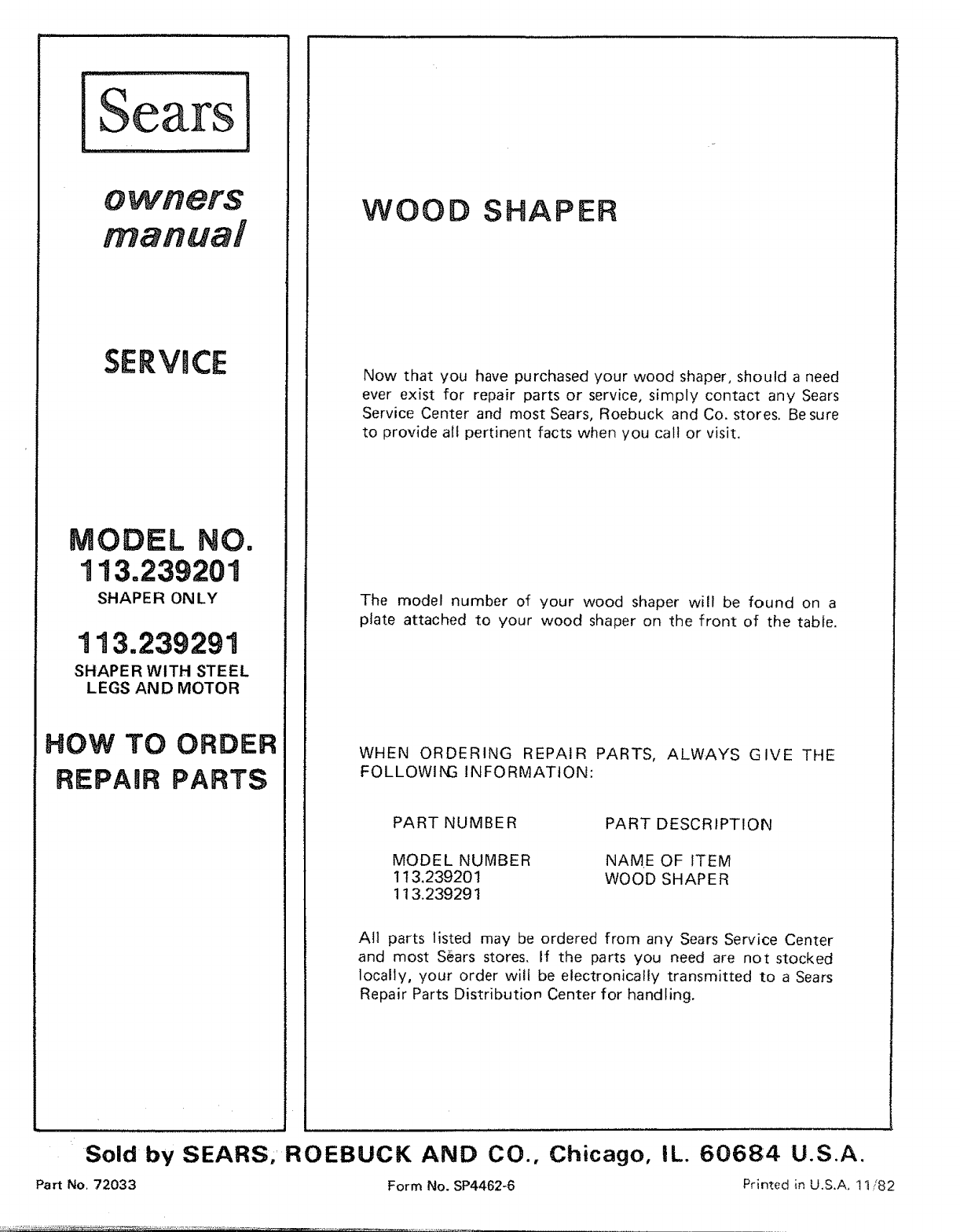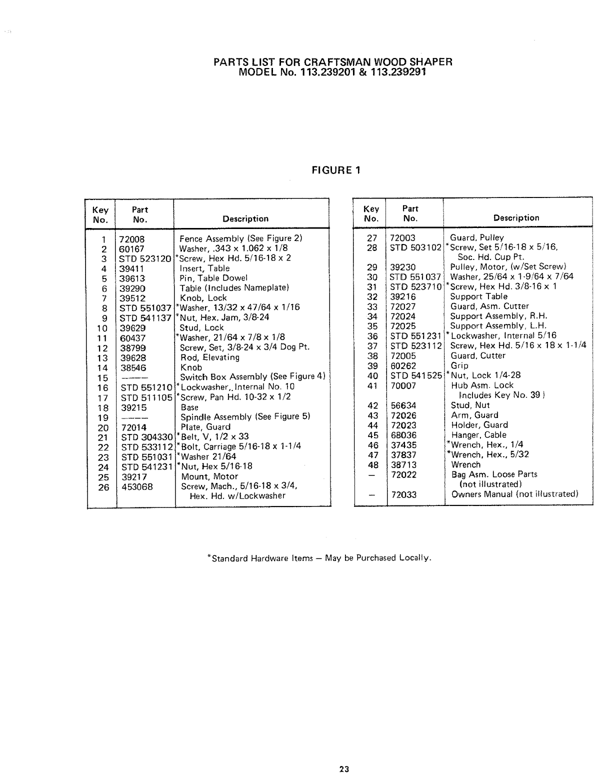 User Manual: Craftsman 113239291 113239291 CRAFTSMAN WOOD SHAPER - Manuals and Guides View the owners manual for your CRAFTSMAN WOOD SHAPER #113239291. Home:Tool Parts:Craftsman Parts:Craftsman WOOD SHAPER Manual