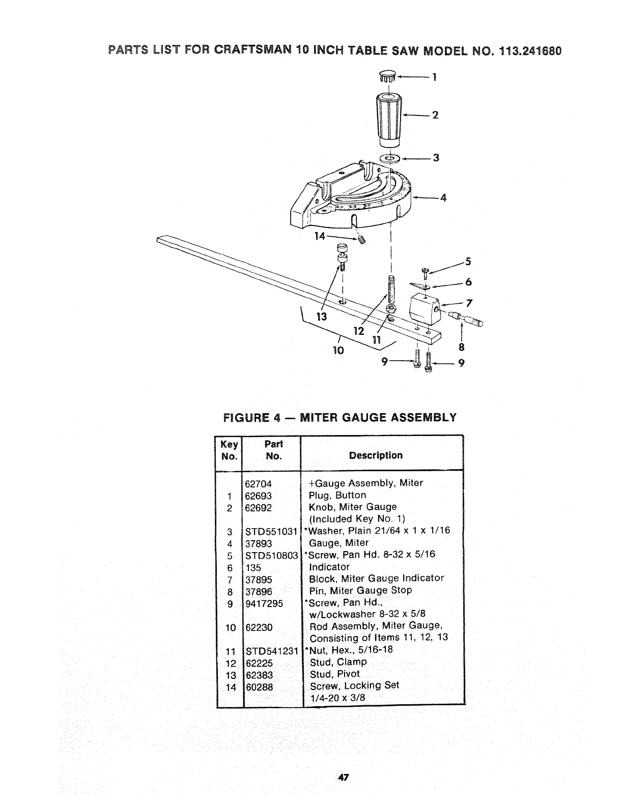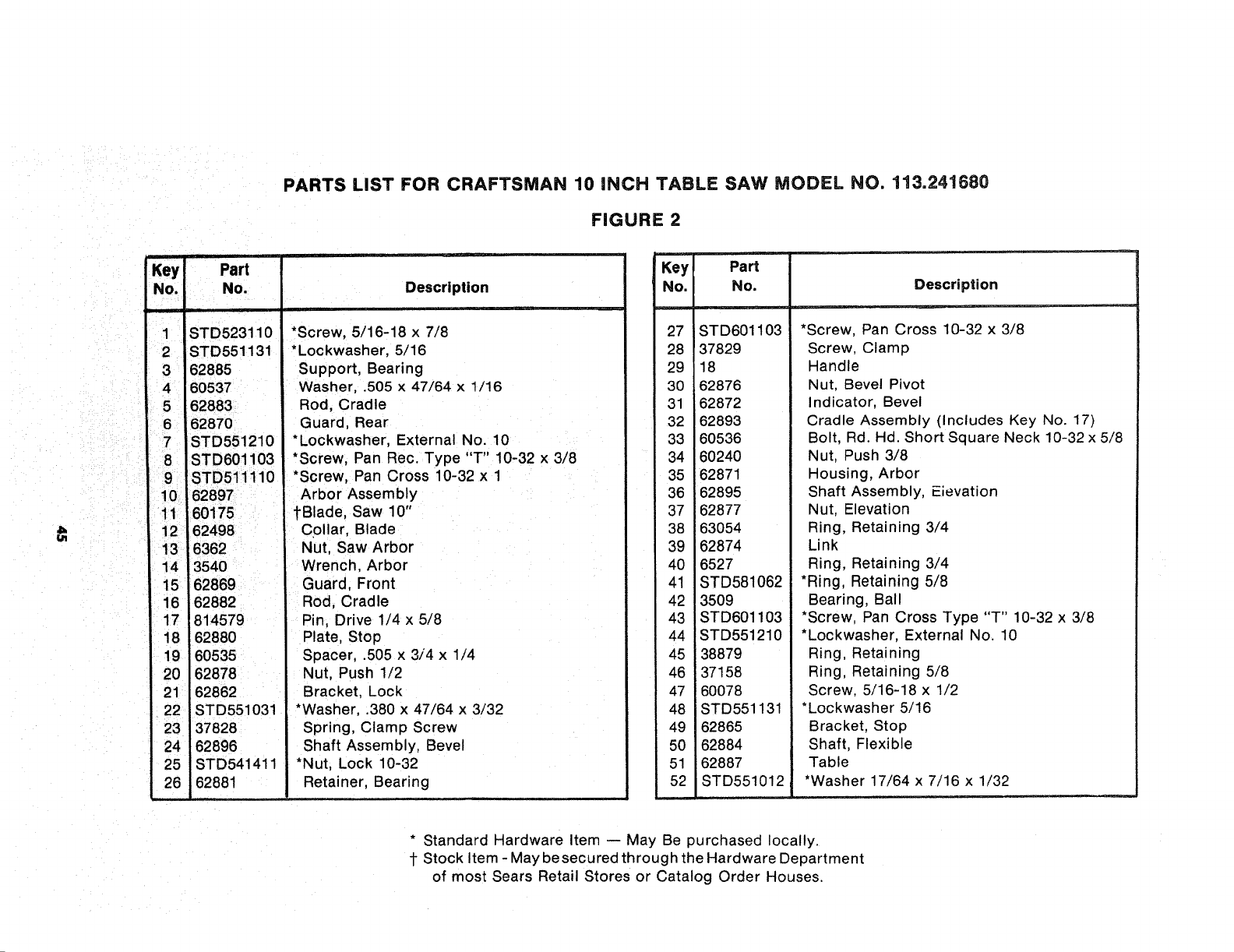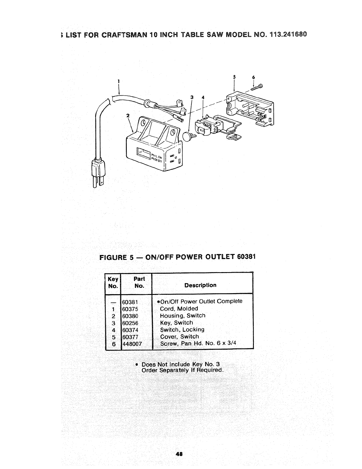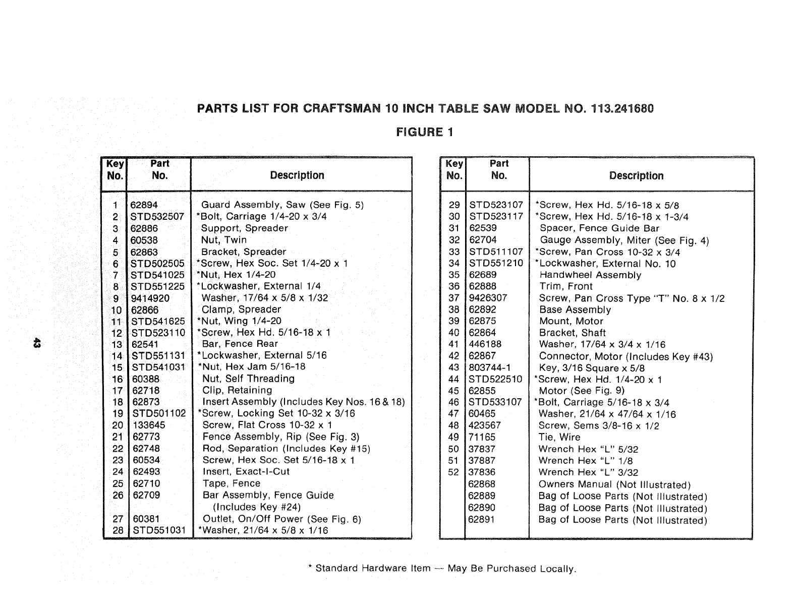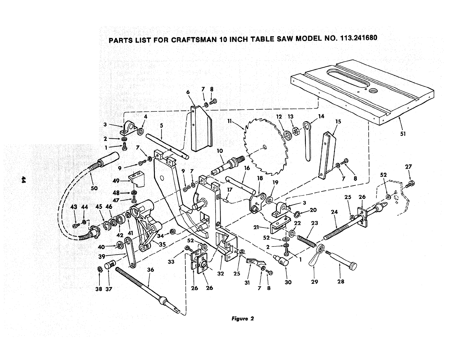 PARTS LIST FOR CRAFTSMAN 10 iNCH TABLE SAW MODEL NO, 113=241680