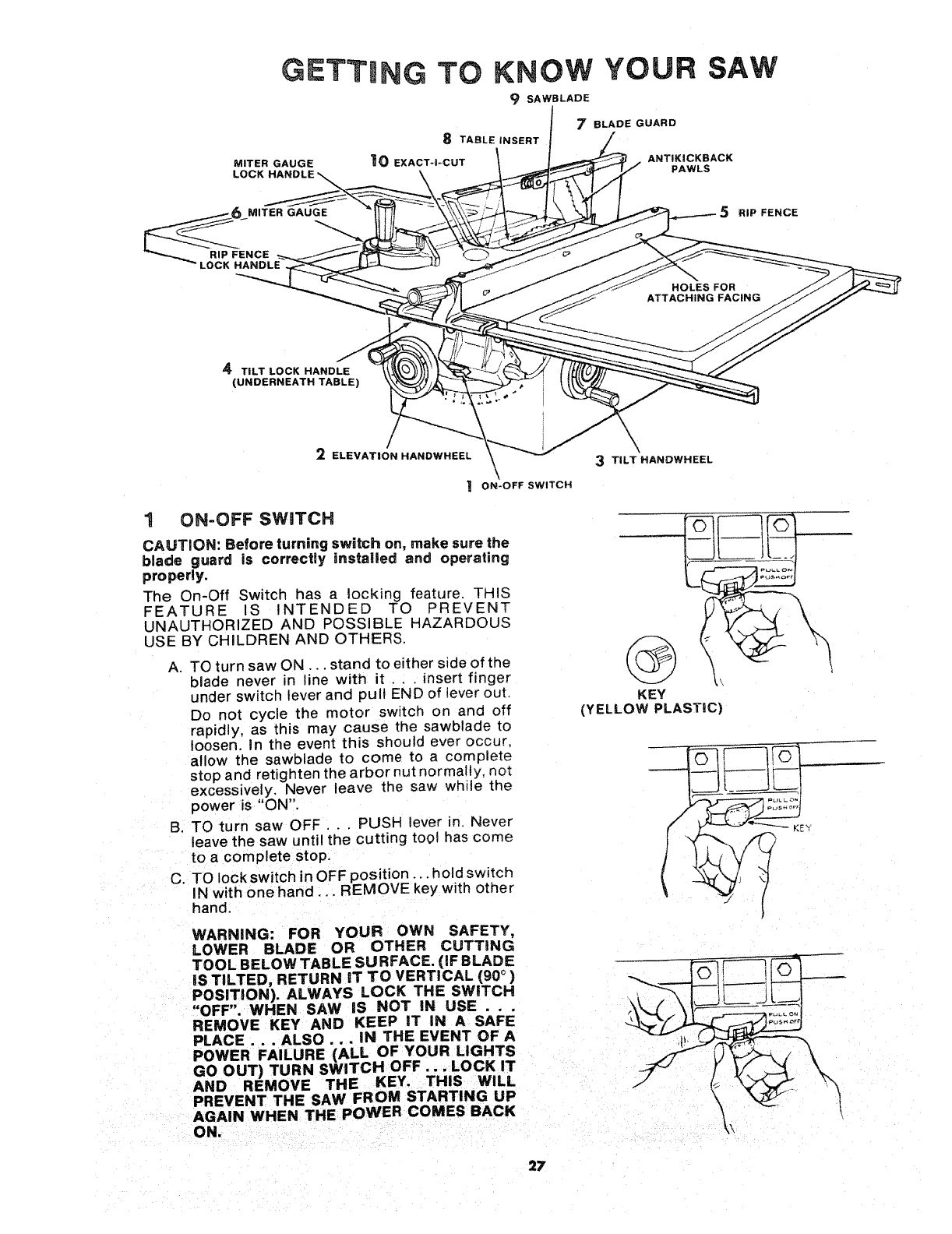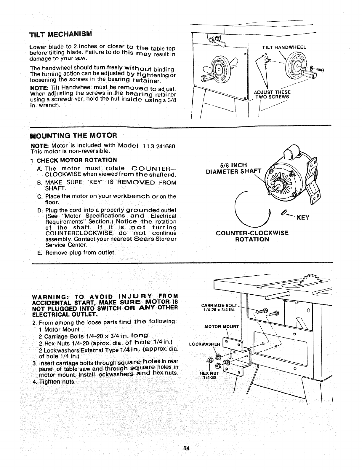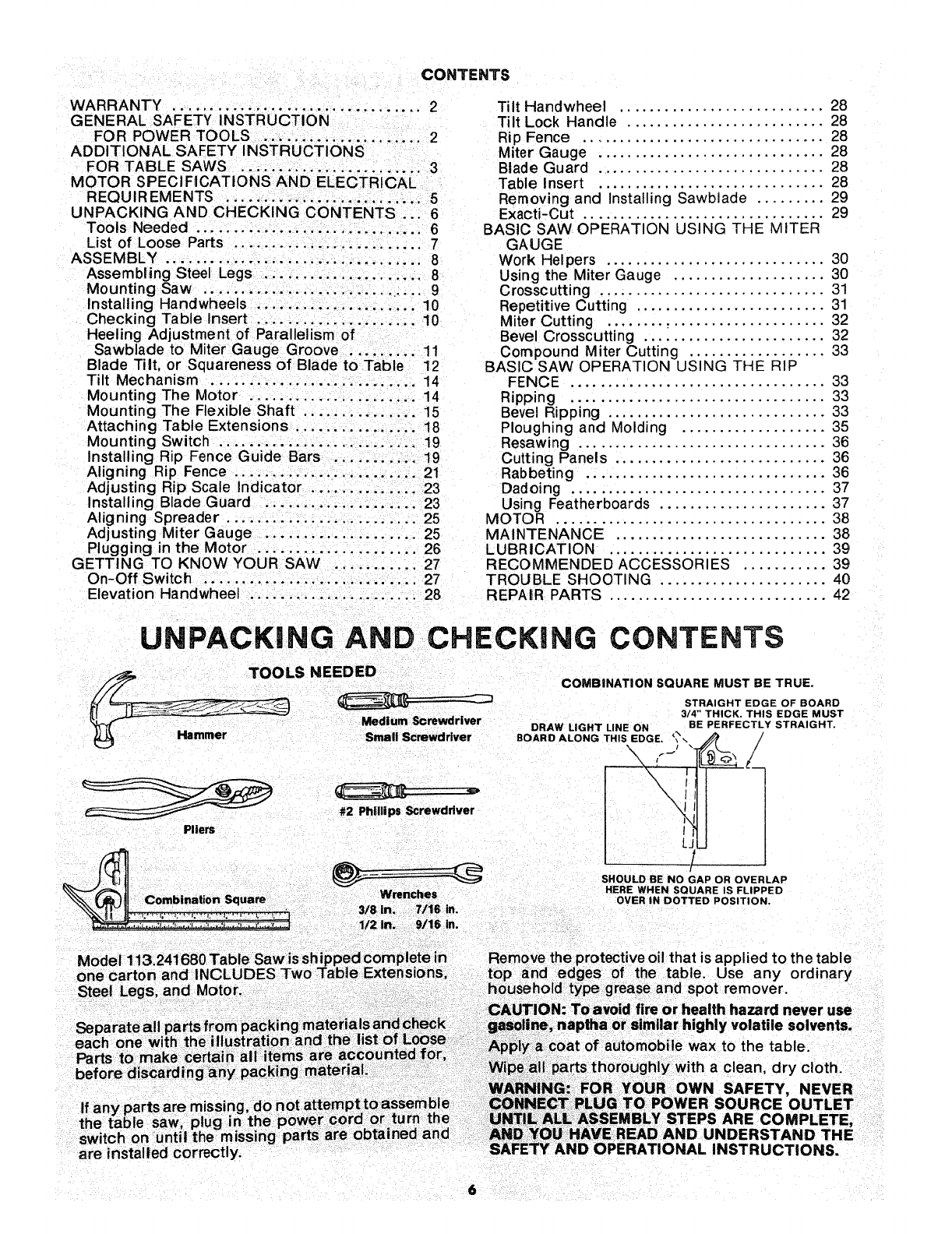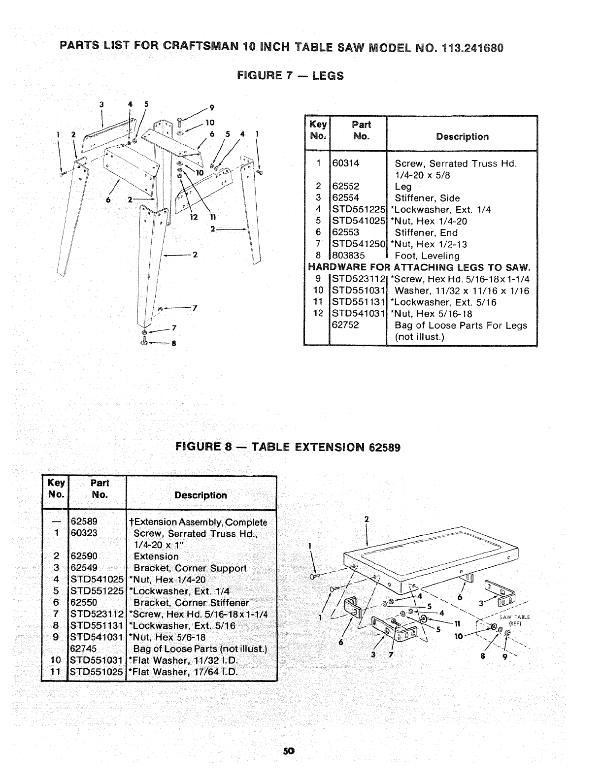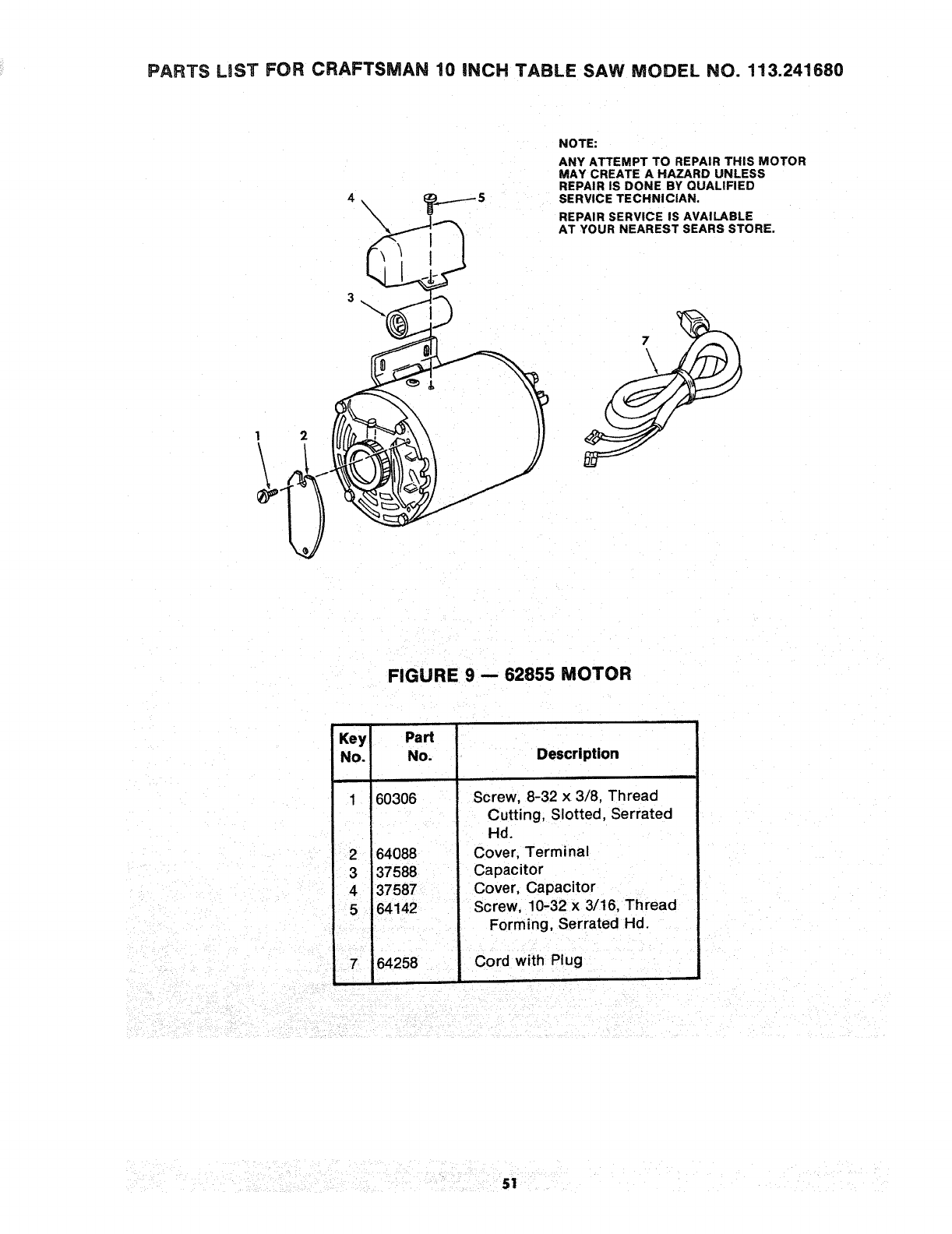 PARTS LIST FOR CRAFTSMAN 10 iNCH TABLE SAW MODEL NO, 113=241680
