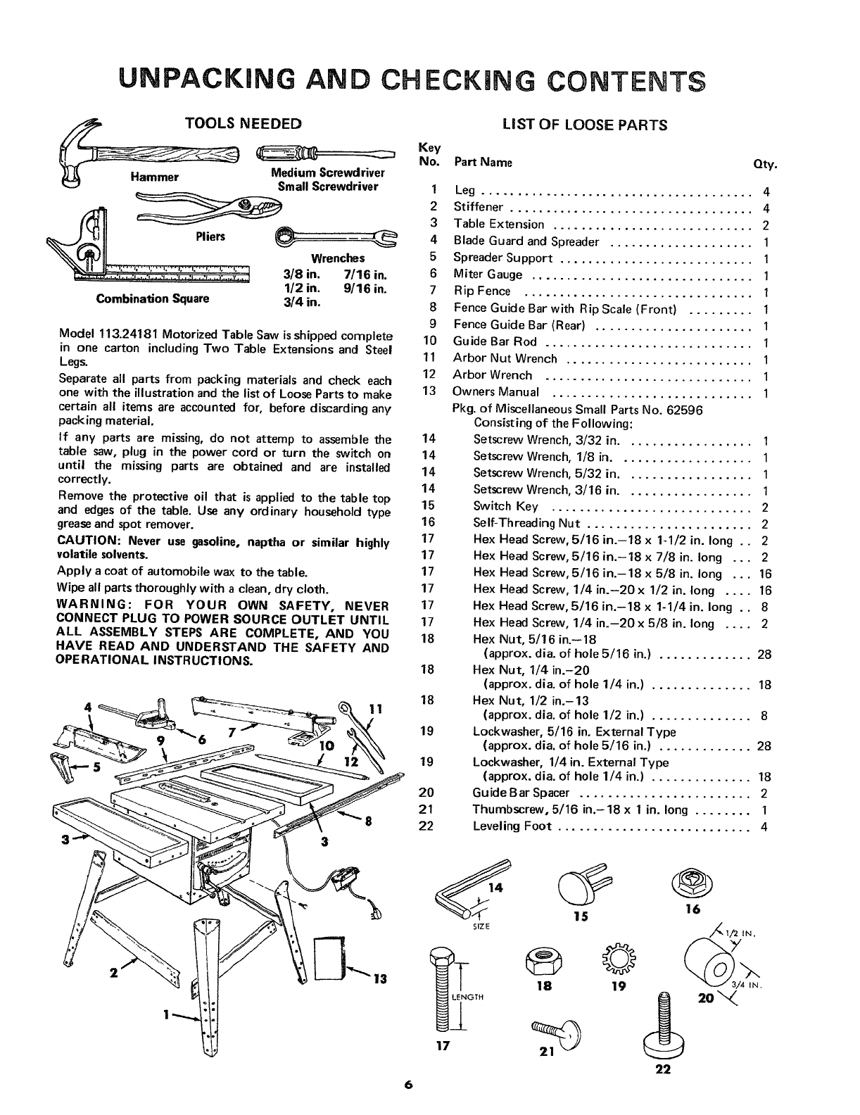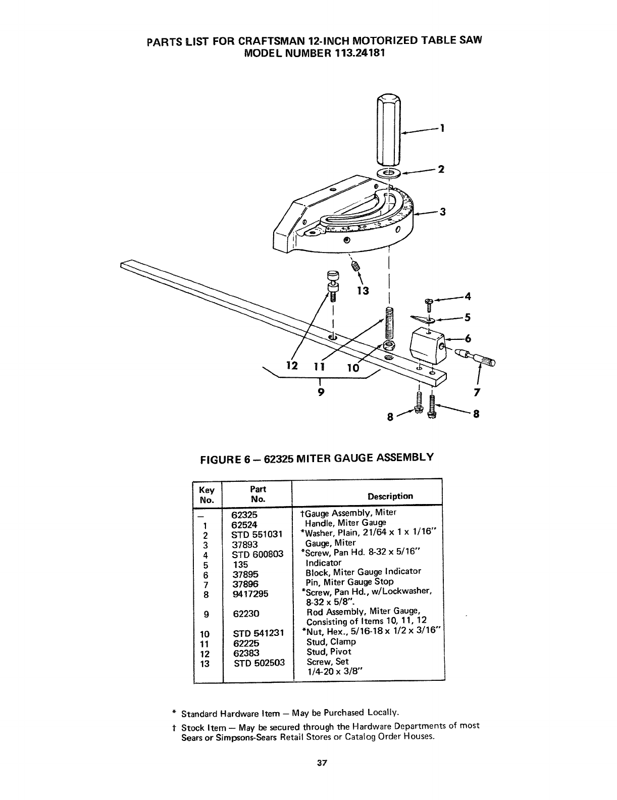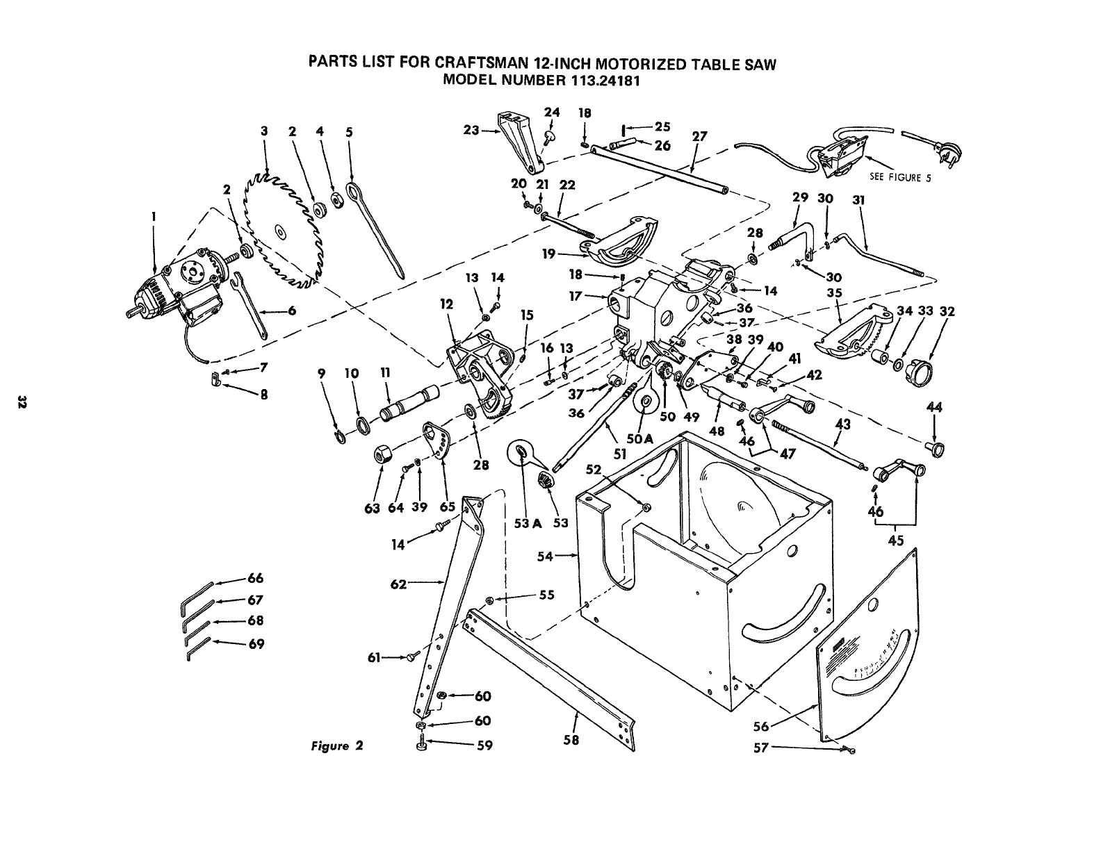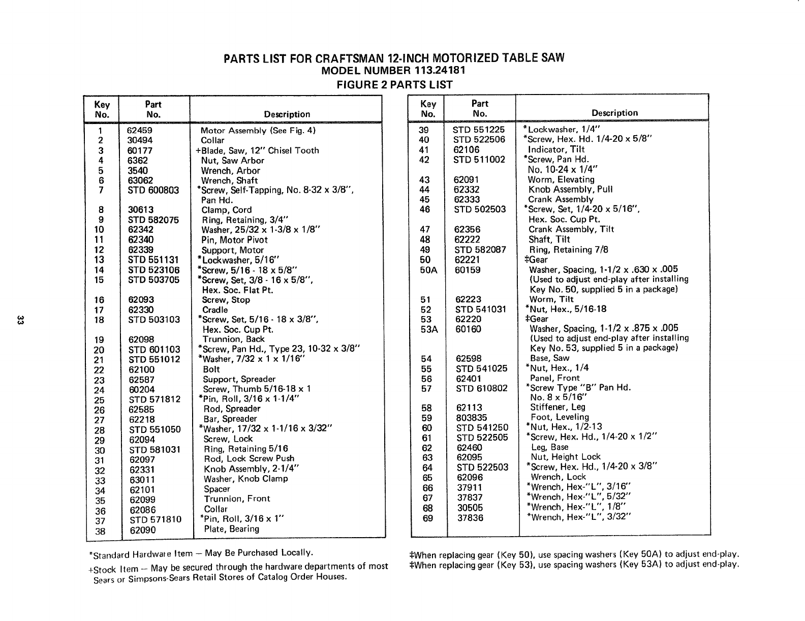 PARTS LIST FOR CRAFTSMAN 12-! NCH MOTORIZED TABLE SAW