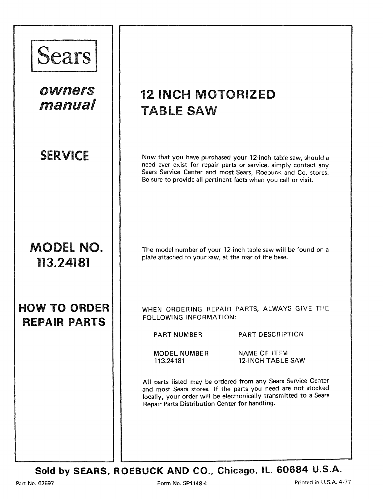 Part No. 62597 Form No. SP4148-4 Printed in U.S.A. 4;77