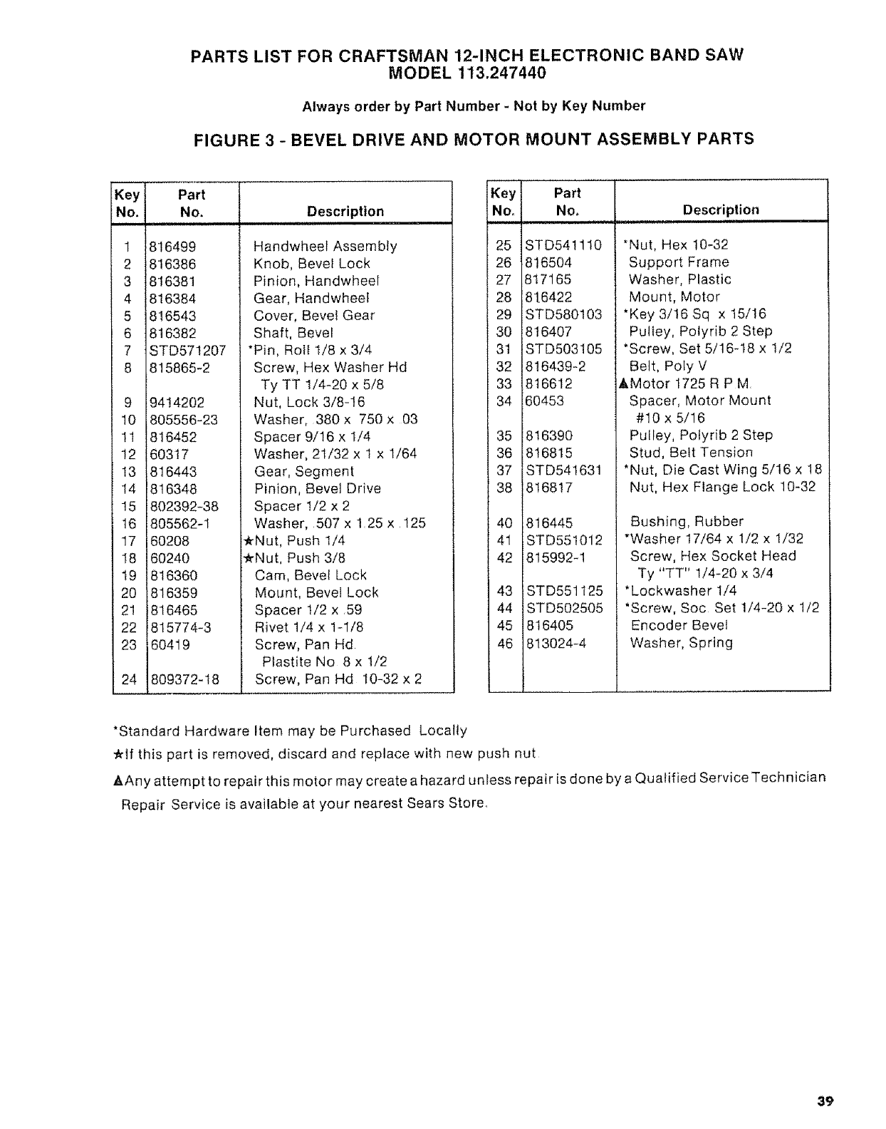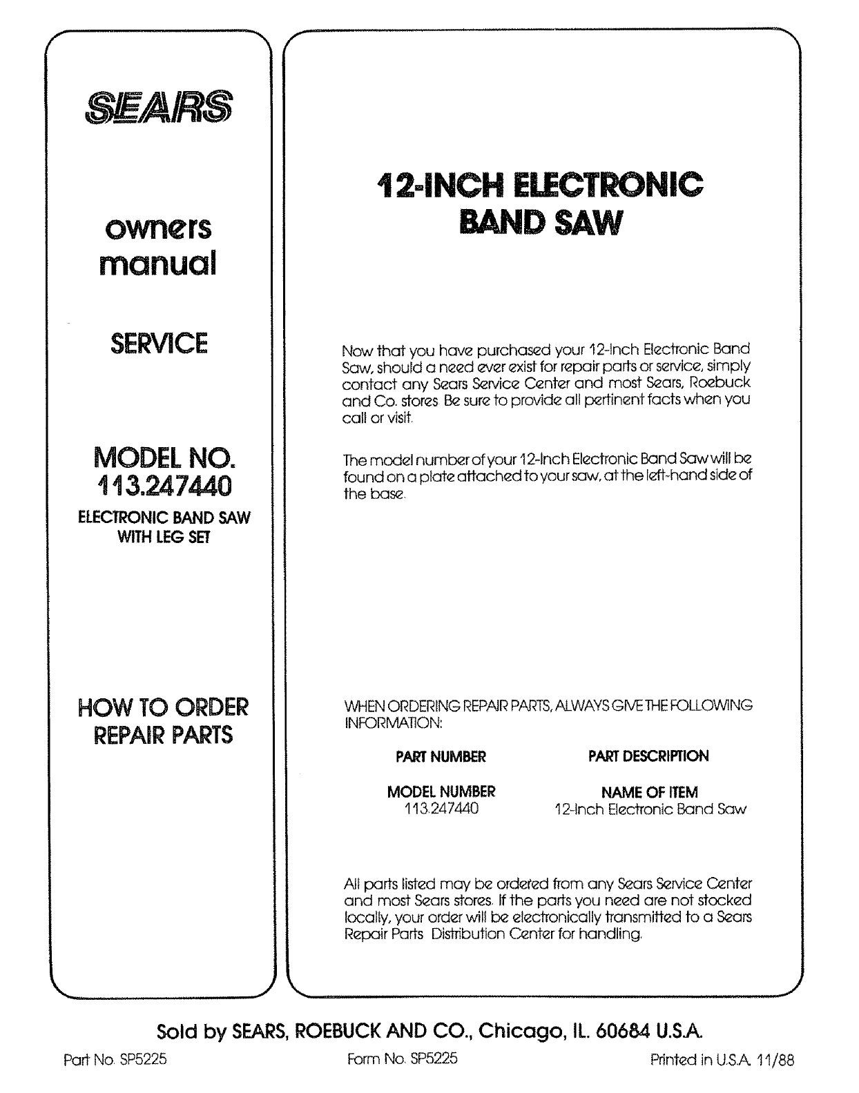 User Manual: Craftsman 113247440 113247440 CRAFTSMAN CRAFTSMAN 12-INCH ELECTRONIC BAND SAW - Manuals and Guides View the owners manual for your CRAFTSMAN CRAFTSMAN 12-INCH ELECTRONIC BAND SAW #113247440. Home:Tool Parts:Craftsman Parts:Craftsman CRAFTSMAN 12-INCH ELECTRONIC BAND SAW Manual