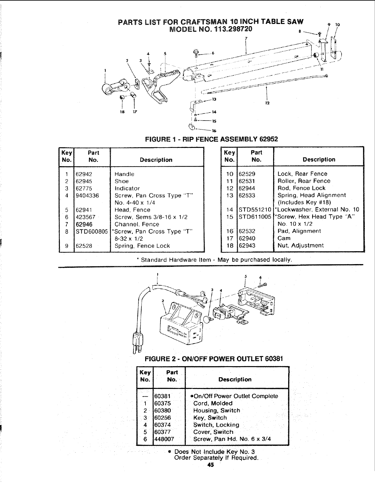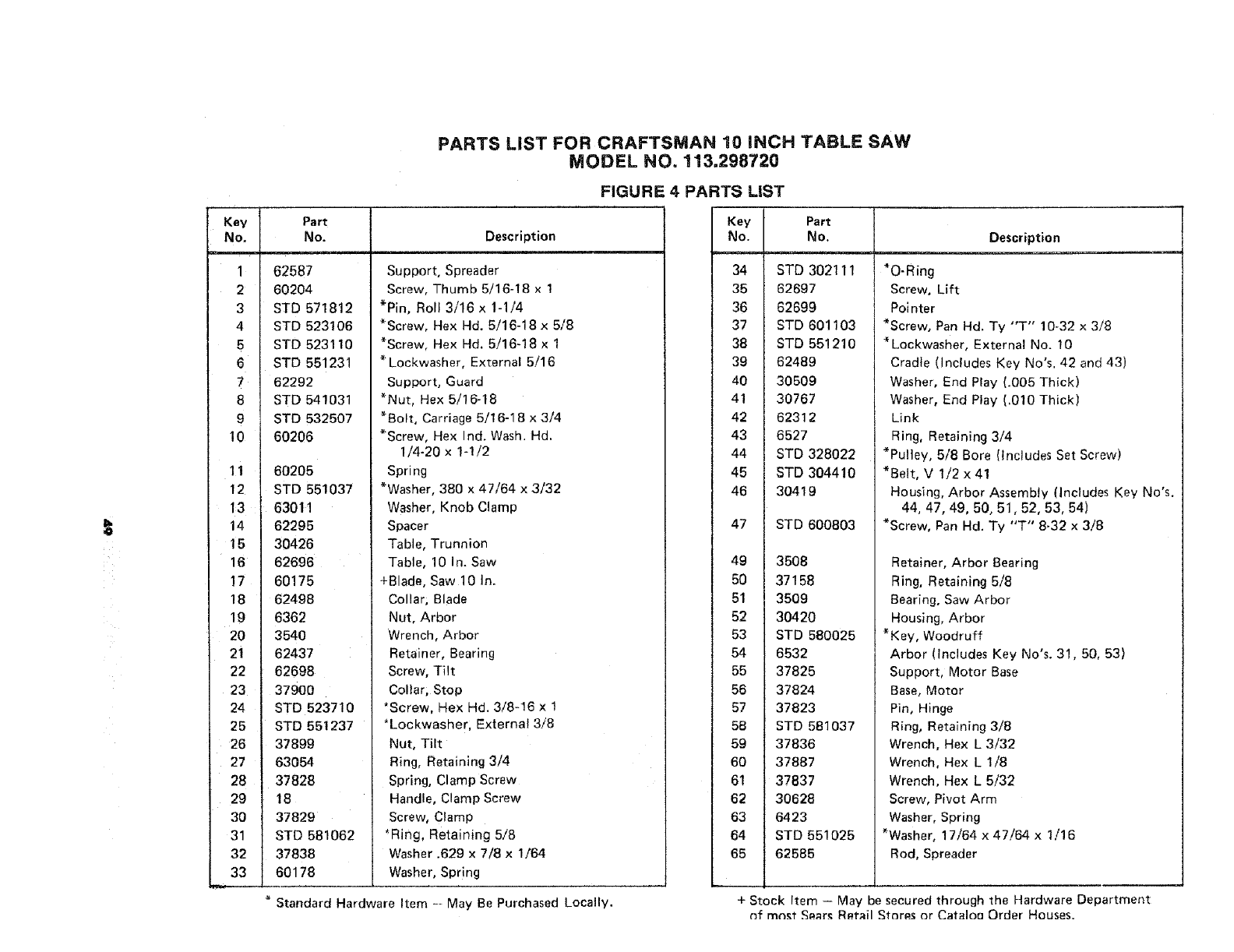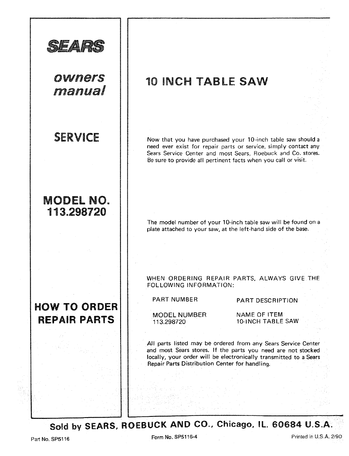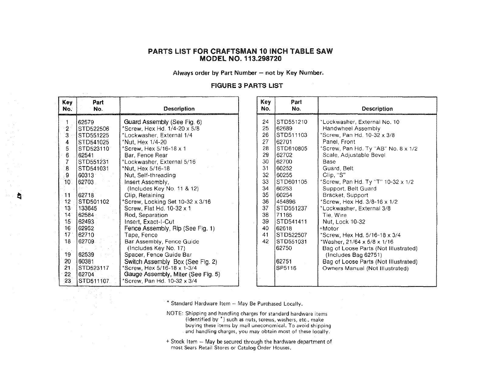 User Manual: Craftsman 113298720 113298720 CRAFTSMAN 10-INCH TABLE SAW - Manuals and Guides View the owners manual for your CRAFTSMAN 10-INCH TABLE SAW #113298720. Home:Tool Parts:Craftsman Parts:Craftsman 10-INCH TABLE SAW Manual