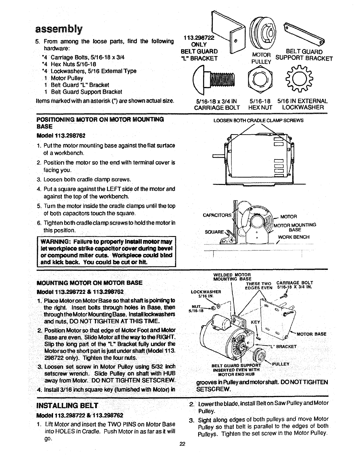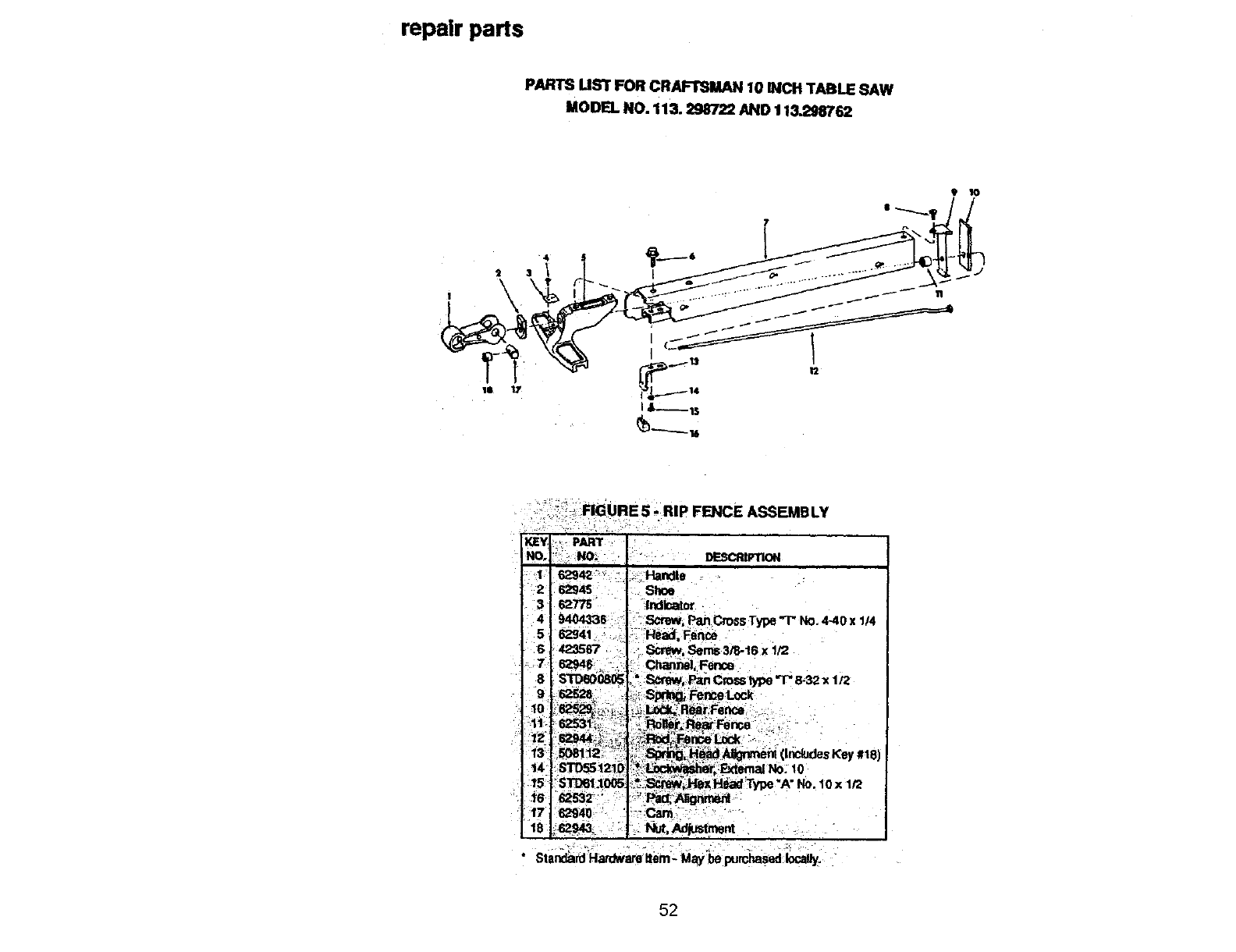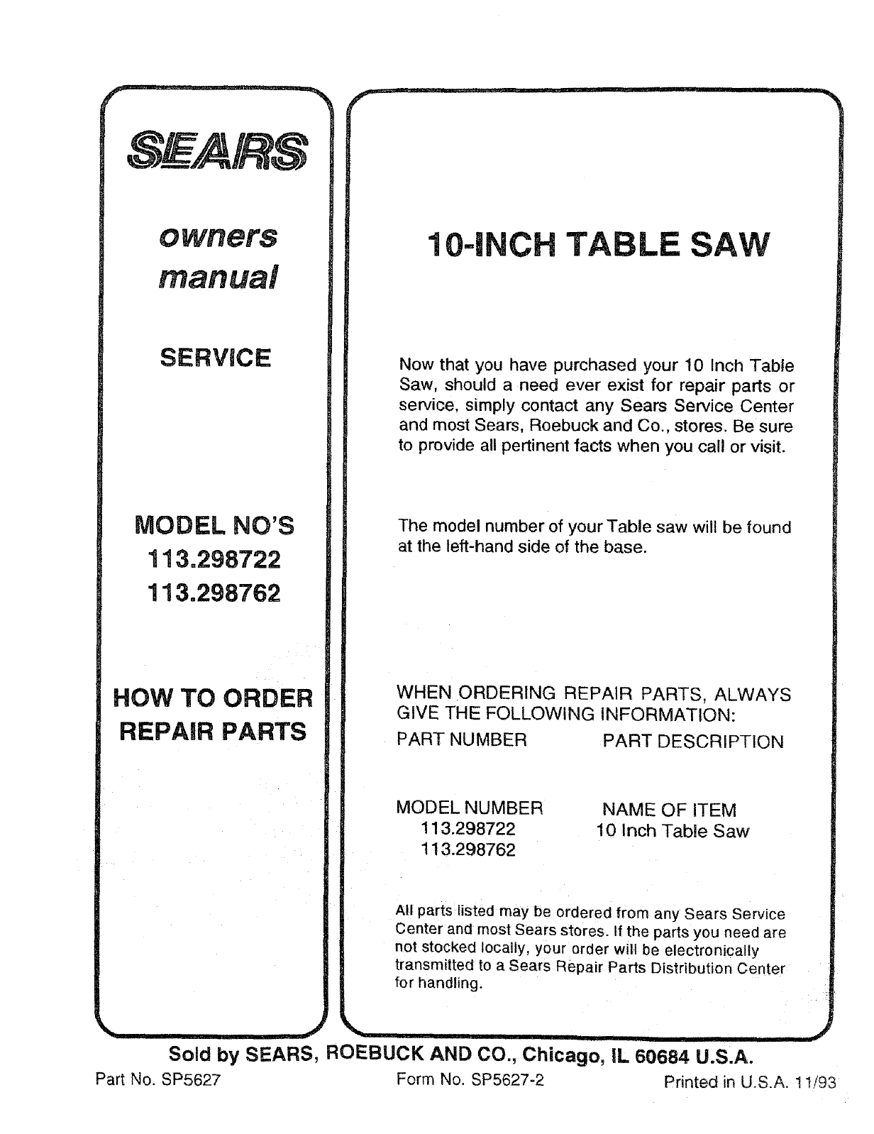 User Manual: Craftsman 113298722 113298722 CRAFTSMAN 10 TABLE SAW - Manuals and Guides View the owners manual for your CRAFTSMAN 10 TABLE SAW #113298722. Home:Tool Parts:Craftsman Parts:Craftsman 10 TABLE SAW Manual