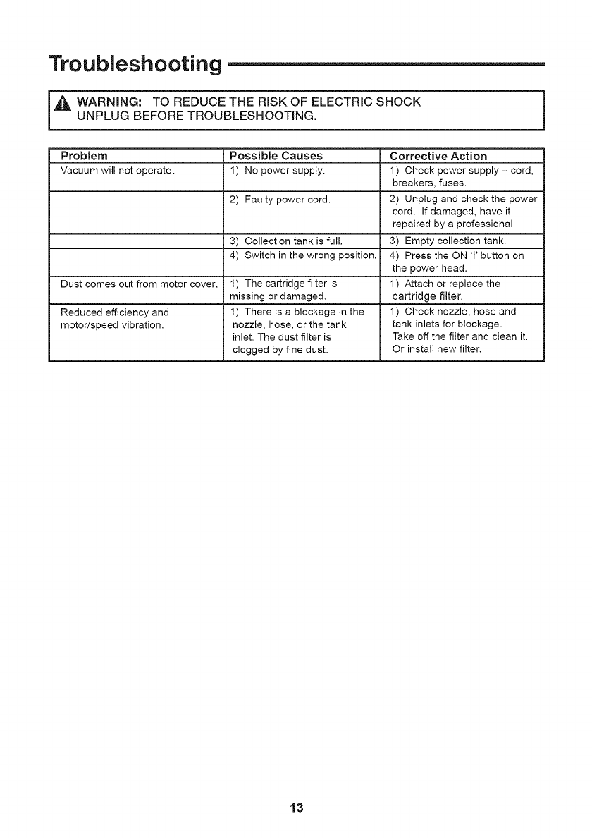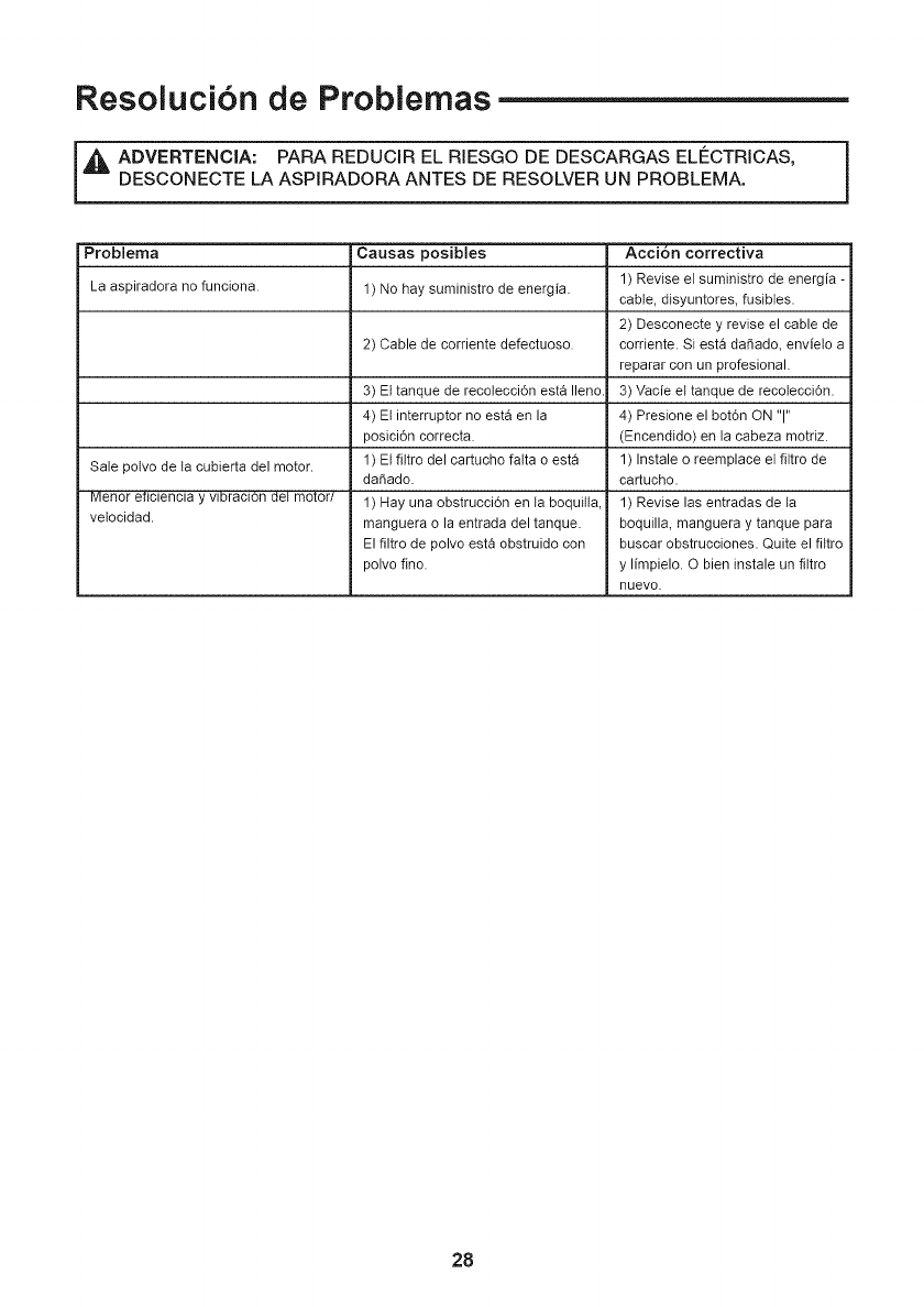 DESCONECTE LA ASPIRADORA ANTES DE RESOLVER UN PROBLEMA.