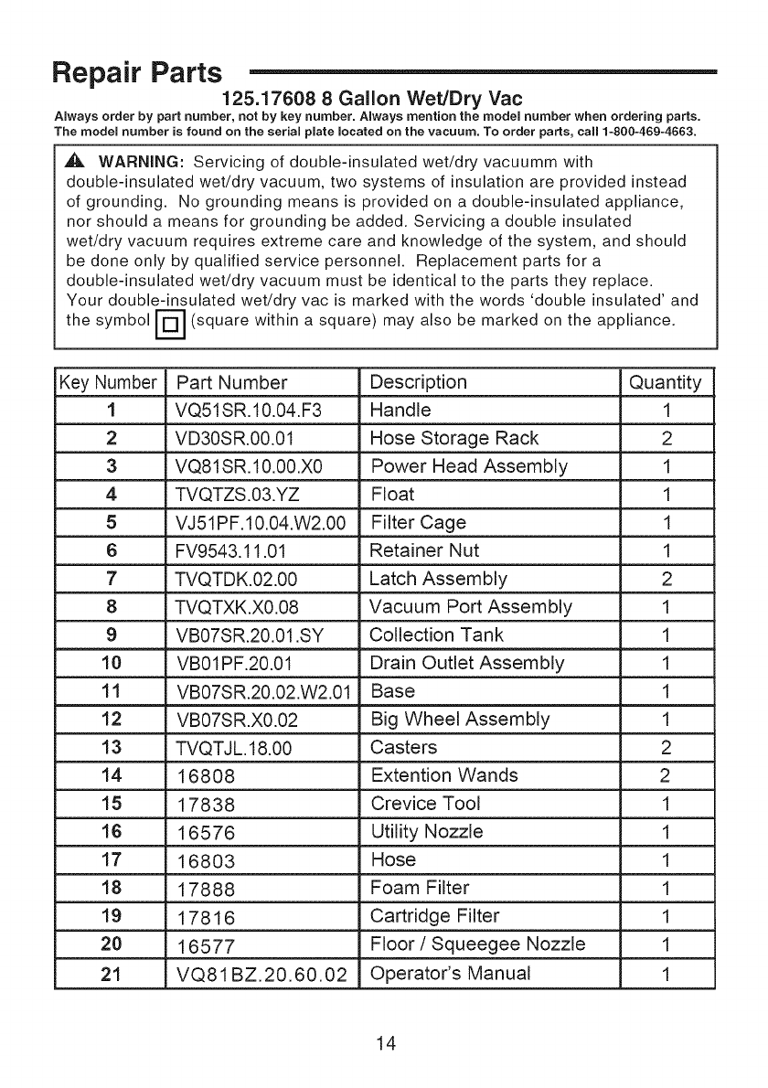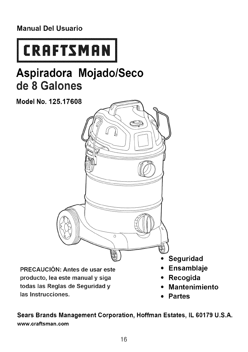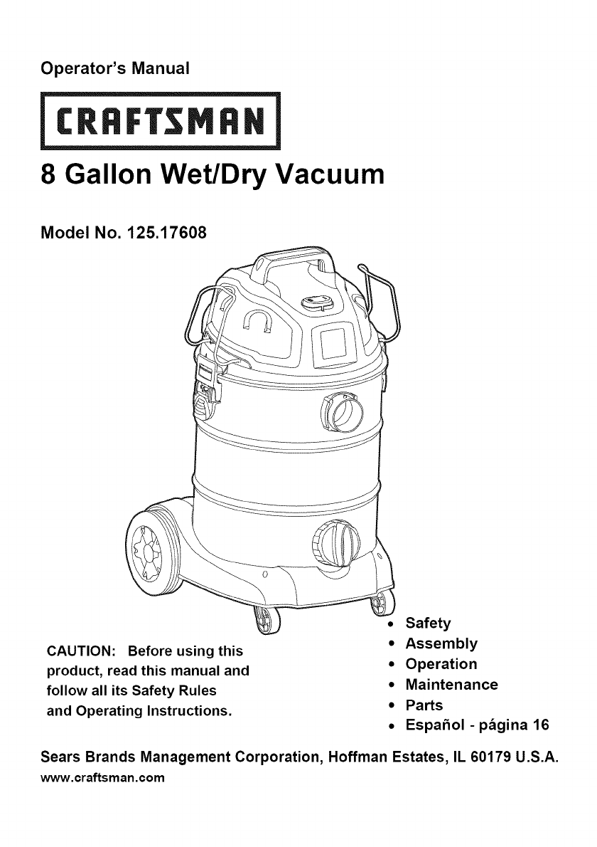 User Manual: Craftsman 12517608 12517608 CRAFTSMAN WET/DRY VACUUM - Manuals and Guides View the owners manual for your CRAFTSMAN WET/DRY VACUUM #12517608. Home:Vacuums & Floor Care Parts:Craftsman Parts:Craftsman WET/DRY VACUUM Manual