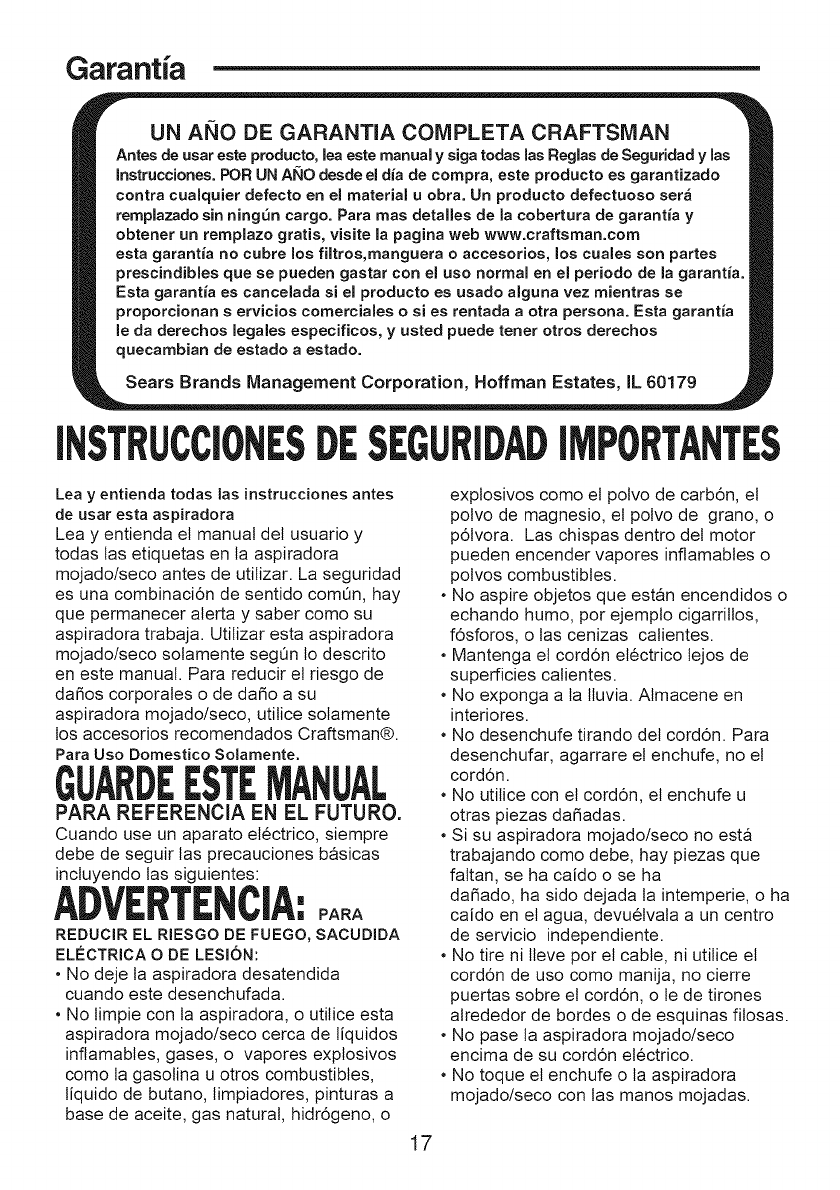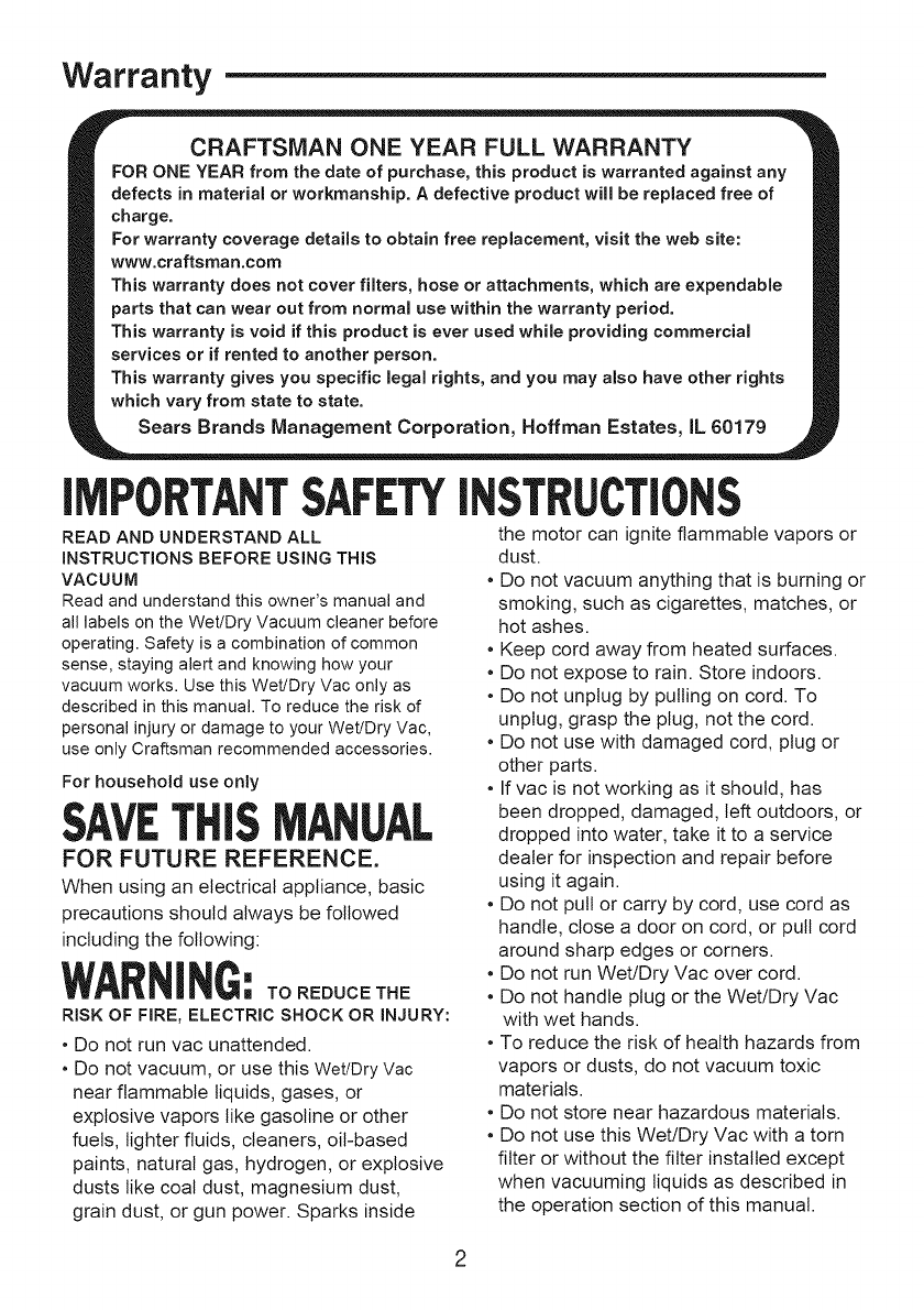 Craftsman 12517608 User Manual WET/DRY VACUUM Manuals And Guides 1312119L