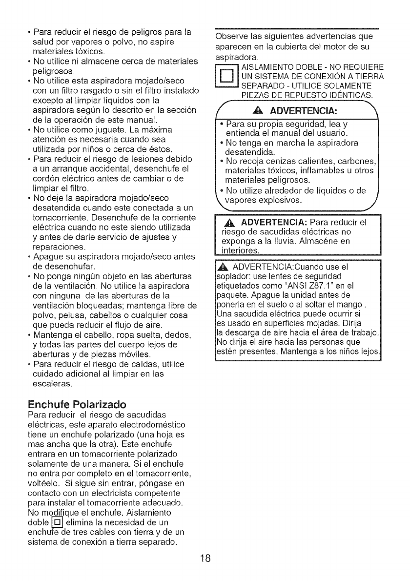 ,_, ADVERTENCIA: En la aspiradora mojado/seco con aislamiento doble se