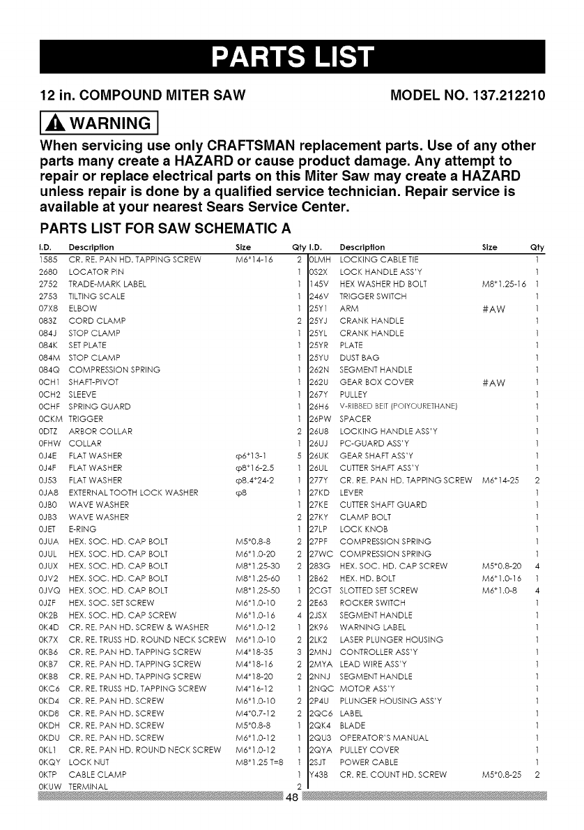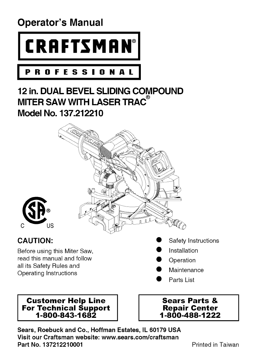 User Manual: Craftsman 137212210 137212210 CRAFTSMAN MITER SAW - Manuals and Guides View the owners manual for your CRAFTSMAN MITER SAW #137212210. Home:Tool Parts:Craftsman Parts:Craftsman MITER SAW Manual