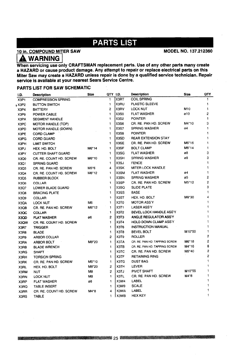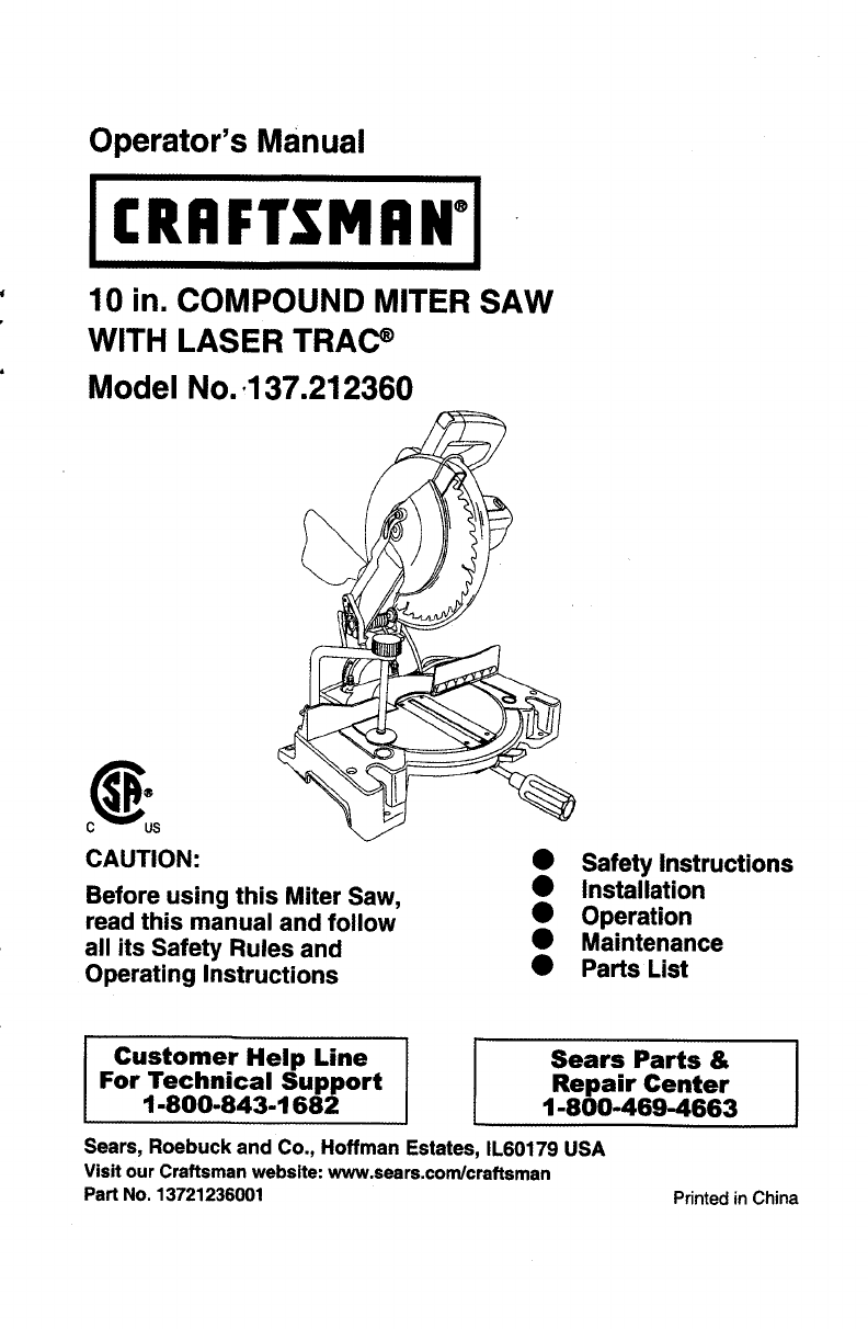 User Manual: Craftsman 137212360 137212360 CRAFTSMAN MITER SAW - Manuals and Guides View the owners manual for your CRAFTSMAN MITER SAW #137212360. Home:Tool Parts:Craftsman Parts:Craftsman MITER SAW Manual