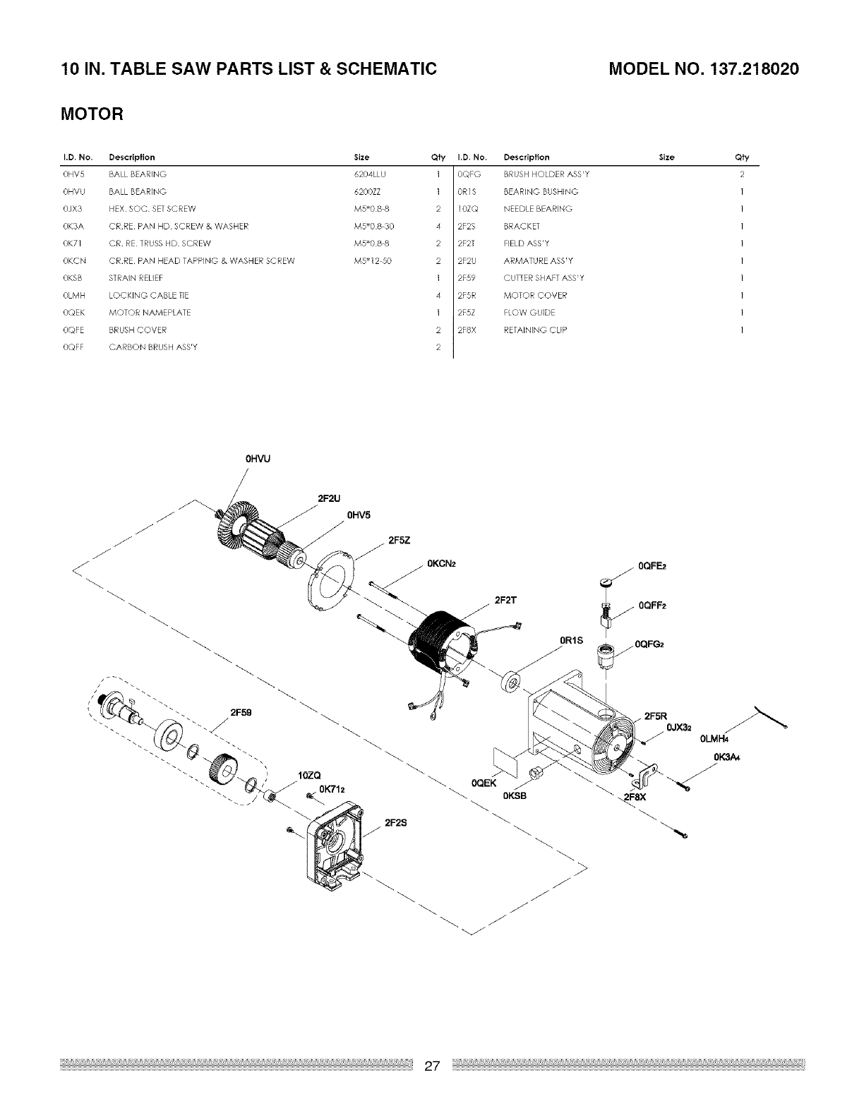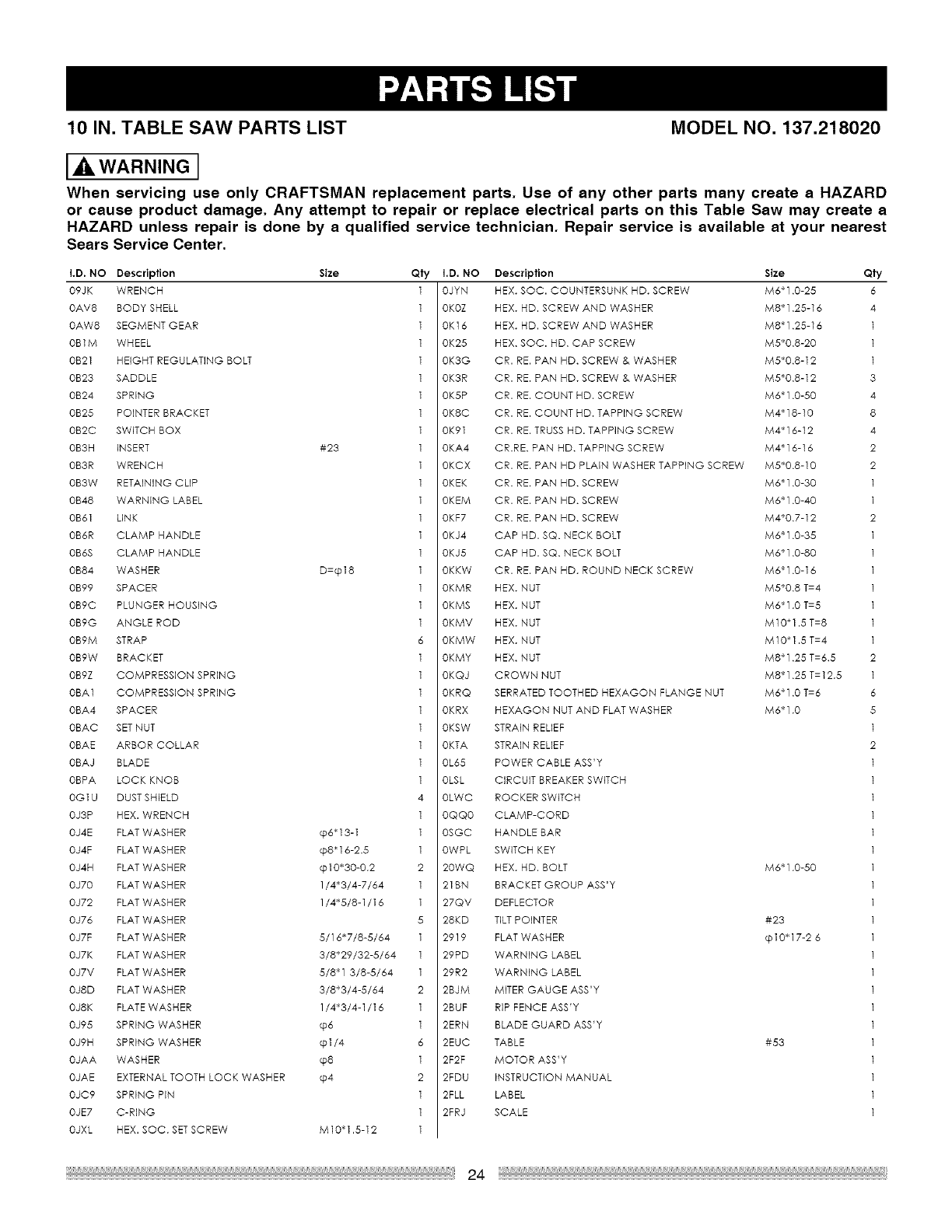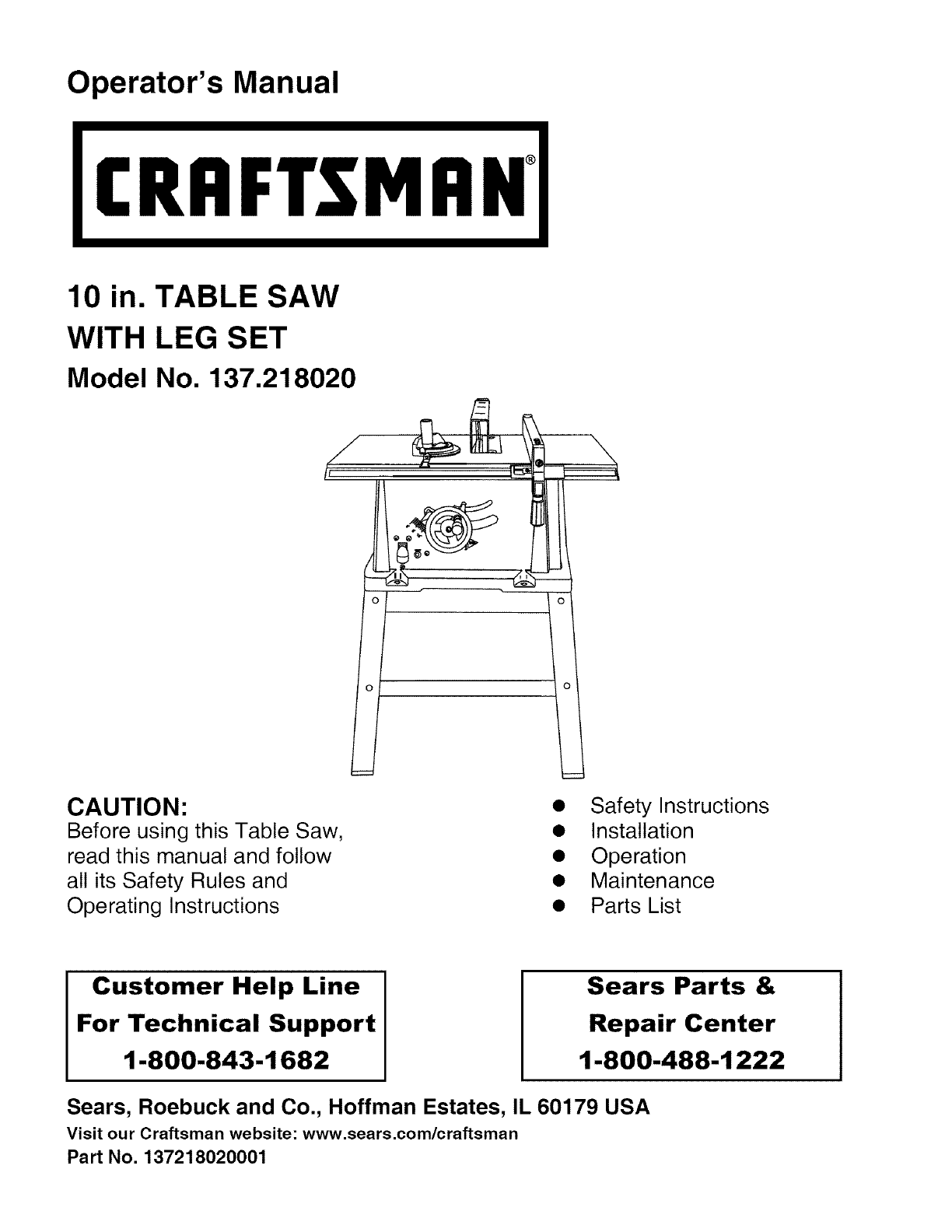 User Manual: Craftsman 137218020 137218020 CRAFTSMAN TABLE SAW - Manuals and Guides View the owners manual for your CRAFTSMAN TABLE SAW #137218020. Home:Tool Parts:Craftsman Parts:Craftsman TABLE SAW Manual