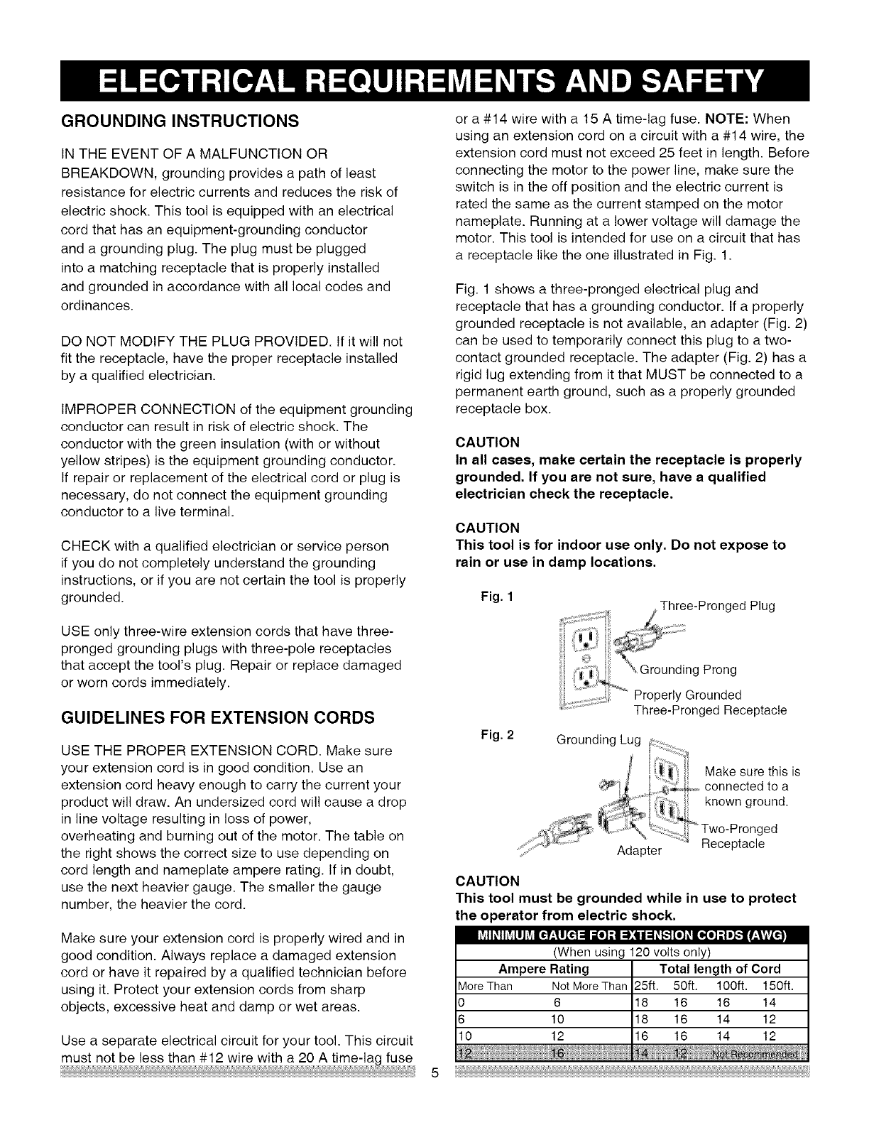 To avoid electrical hazards, fire hazards or damage to the table saw, use proper circuit protection.