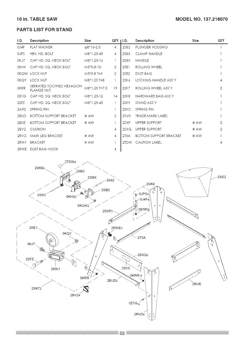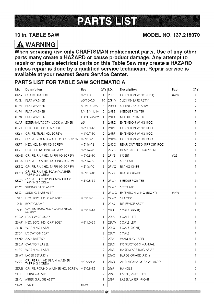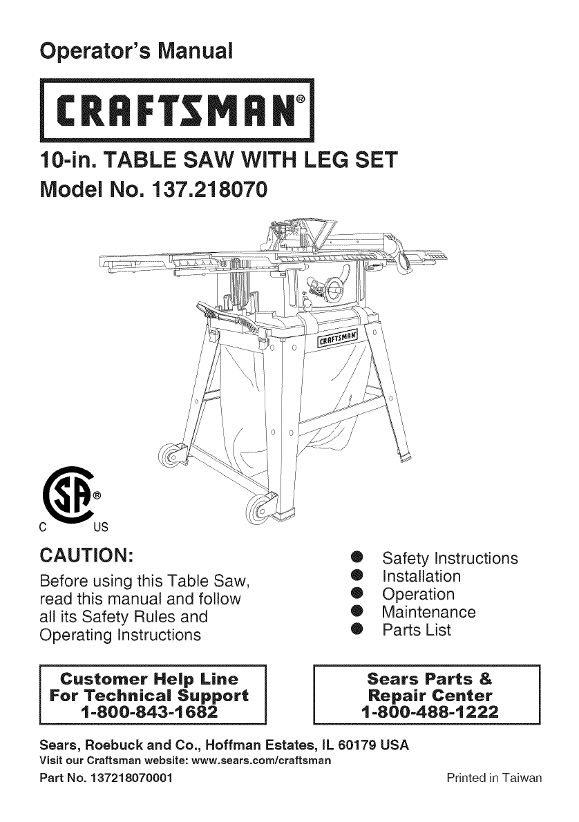 User Manual: Craftsman 137218070 137218070 CRAFTSMAN TABLE SAW/STAND - Manuals and Guides View the owners manual for your CRAFTSMAN TABLE SAW/STAND #137218070. Home:Tool Parts:Craftsman Parts:Craftsman TABLE SAW/STAND Manual