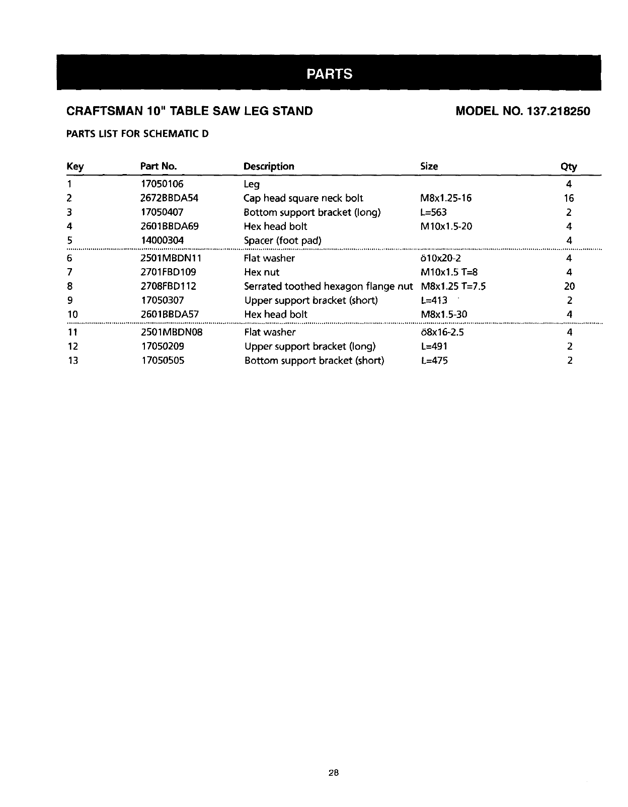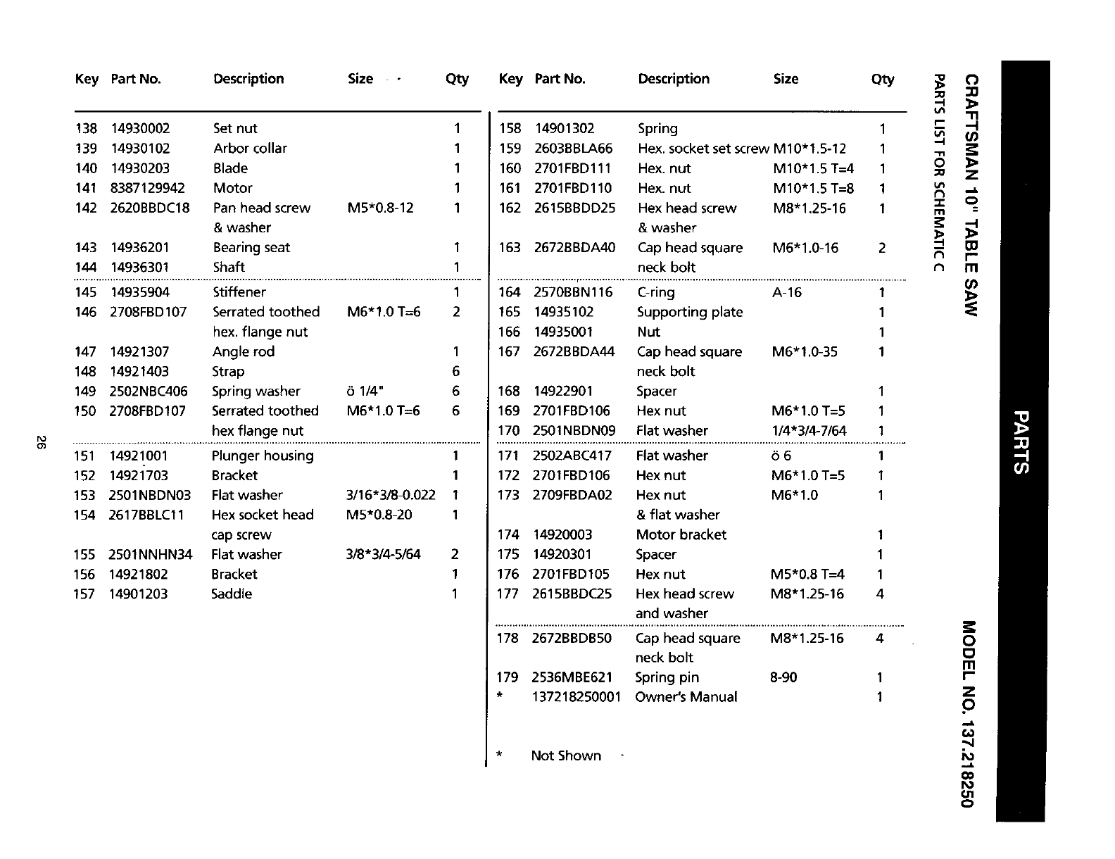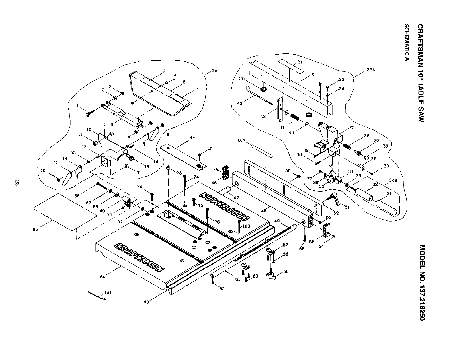 User Manual: Craftsman 137218250 137218250 CRAFTSMAN TABLE SAW - Manuals and Guides View the owners manual for your CRAFTSMAN TABLE SAW #137218250. Home:Tool Parts:Craftsman Parts:Craftsman TABLE SAW Manual