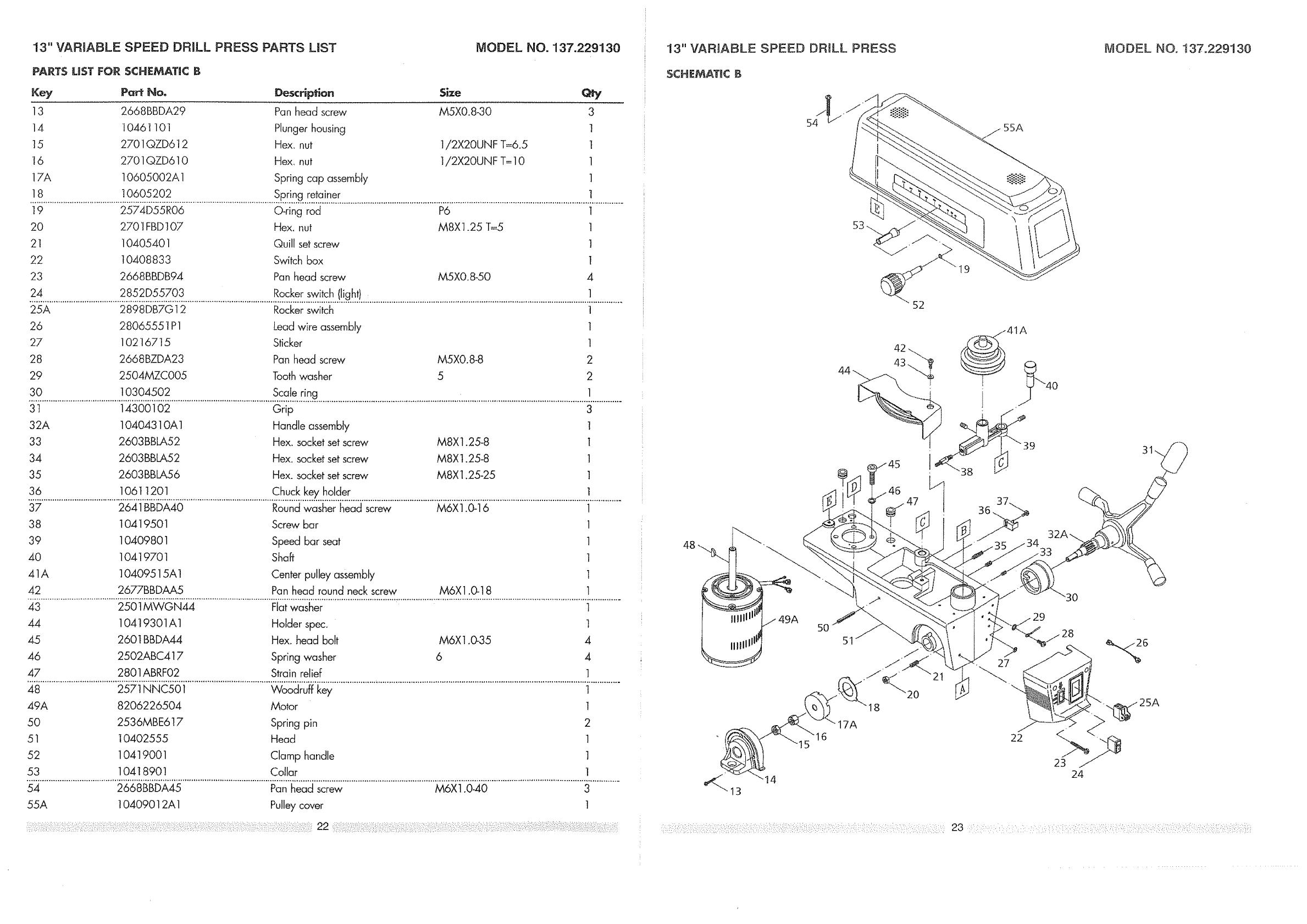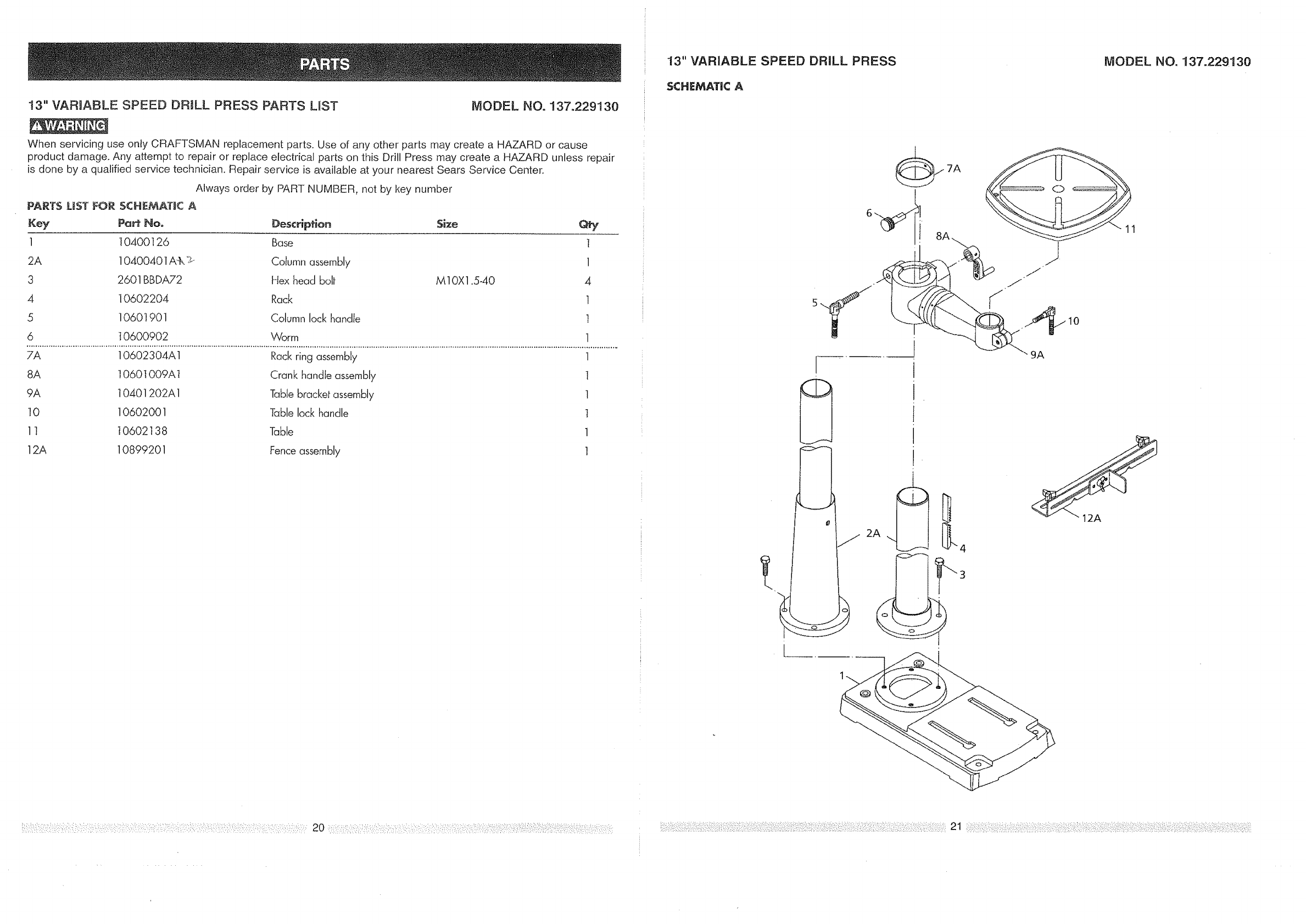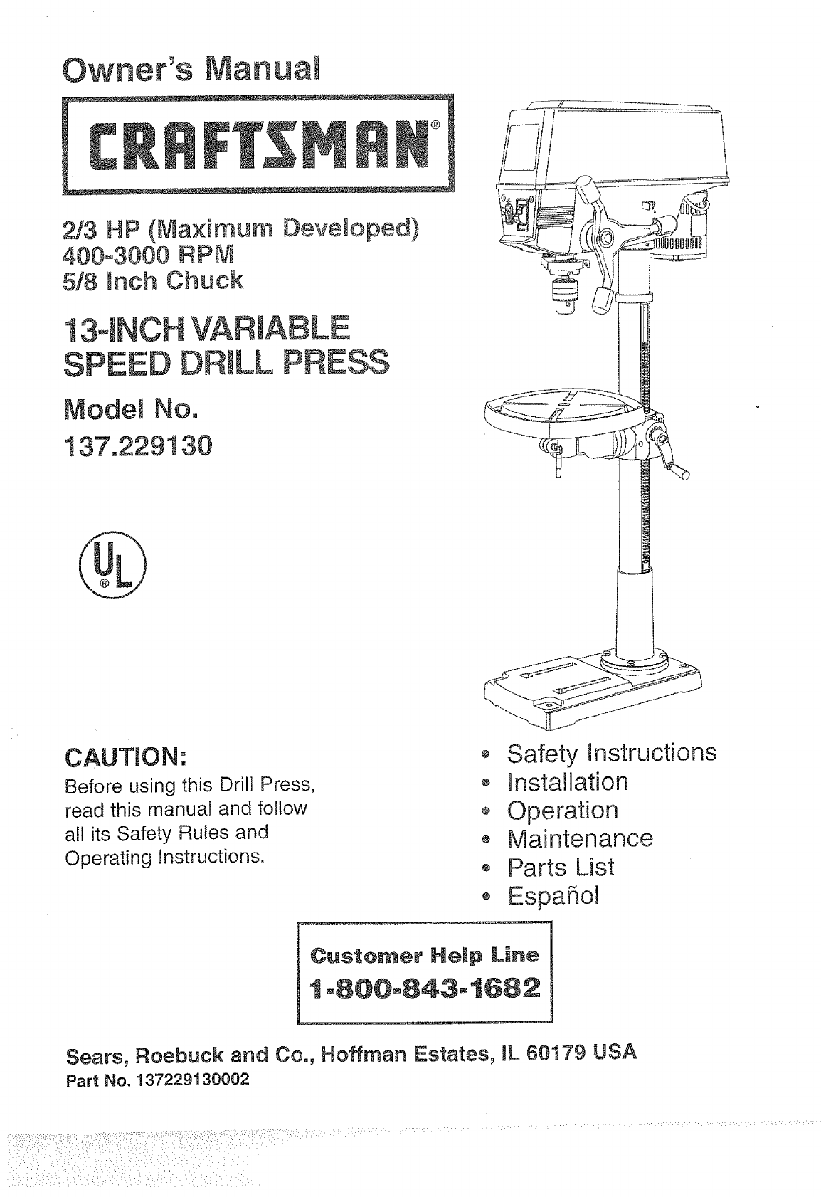 User Manual: Craftsman 137229130 137229130 CRAFTSMAN DRILL PRESS - Manuals and Guides View the owners manual for your CRAFTSMAN DRILL PRESS #137229130. Home:Tool Parts:Craftsman Parts:Craftsman DRILL PRESS Manual