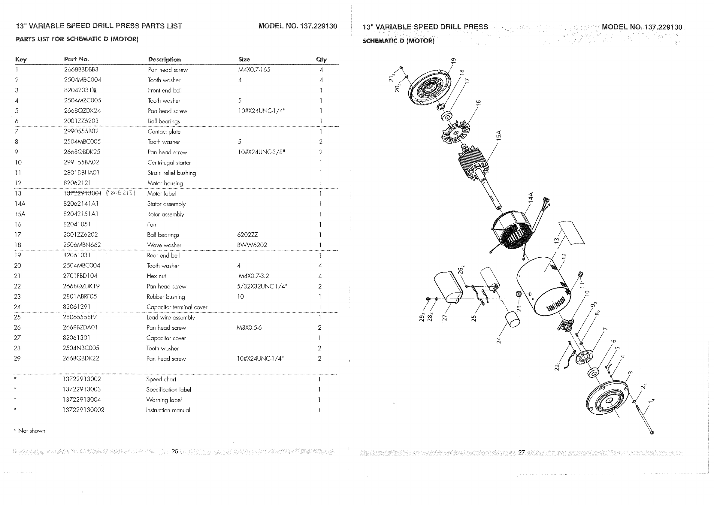 13" VARIABLE SPEED DRILL PRESS PARTS LIST