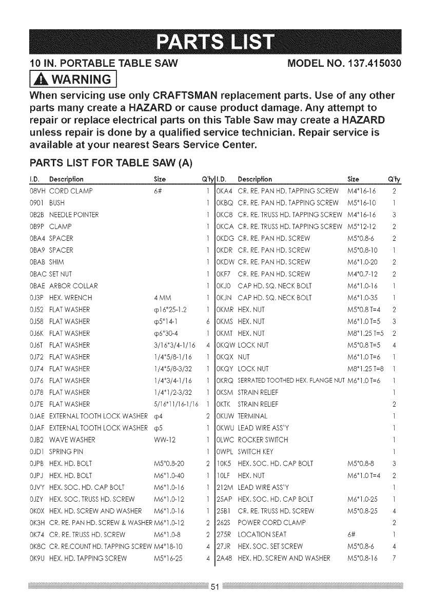 User Manual: Craftsman 137415030 137415030 CRAFTSMAN TABLE SAW - Manuals and Guides View the owners manual for your CRAFTSMAN TABLE SAW #137415030. Home:Tool Parts:Craftsman Parts:Craftsman TABLE SAW Manual