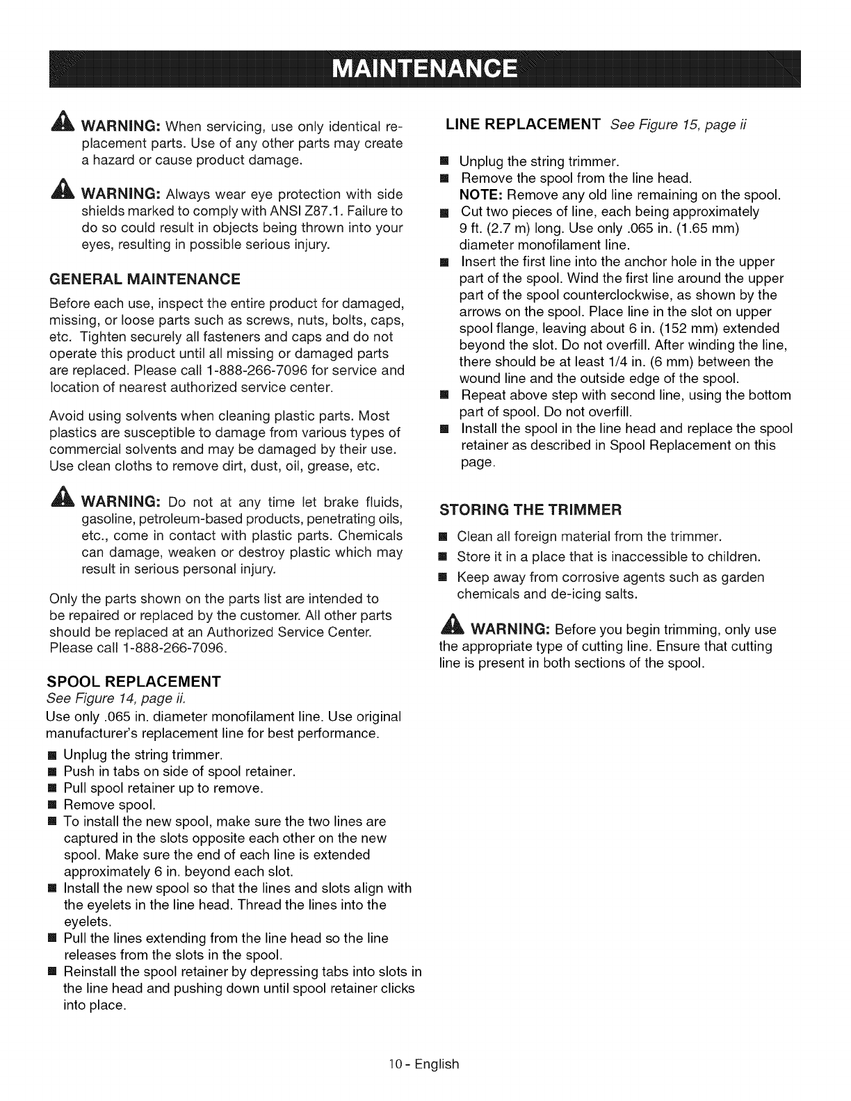 This warranty does not cover the trimming line or replacement spool, which are expendable parts that can wear out from