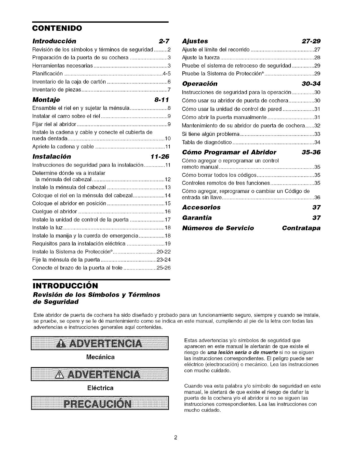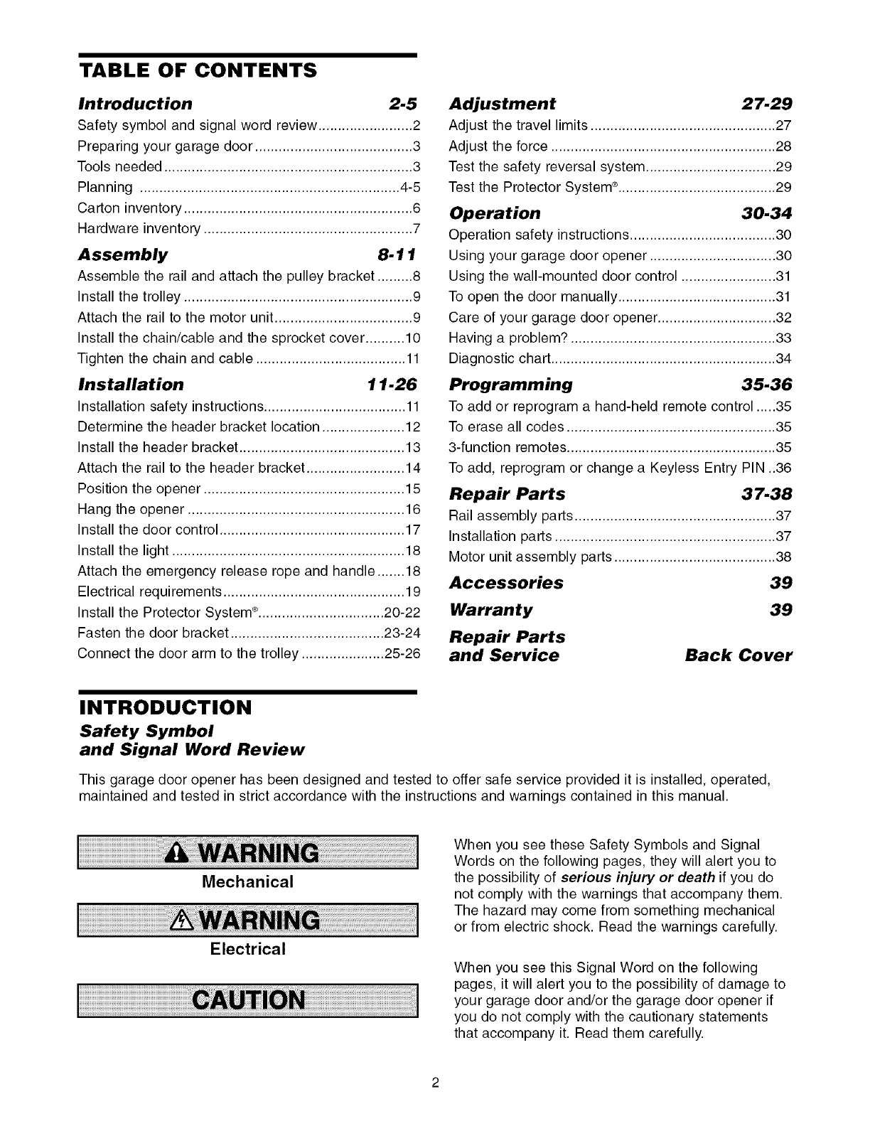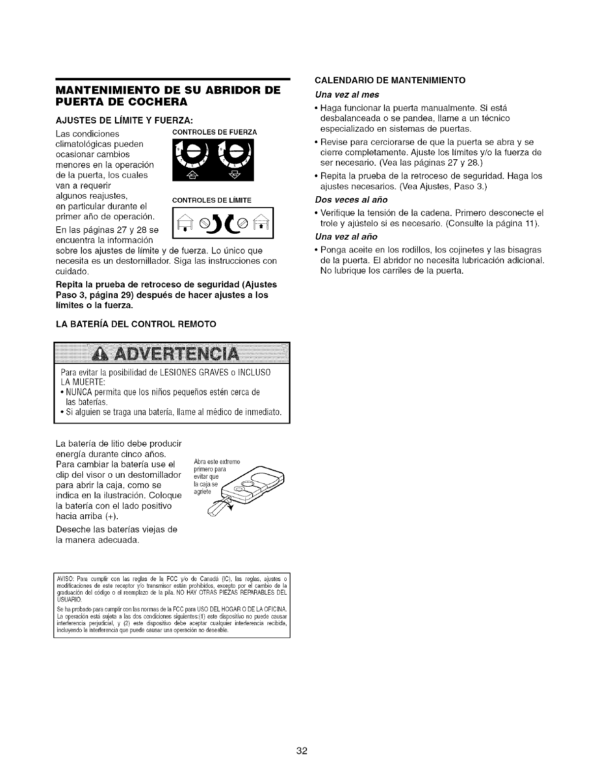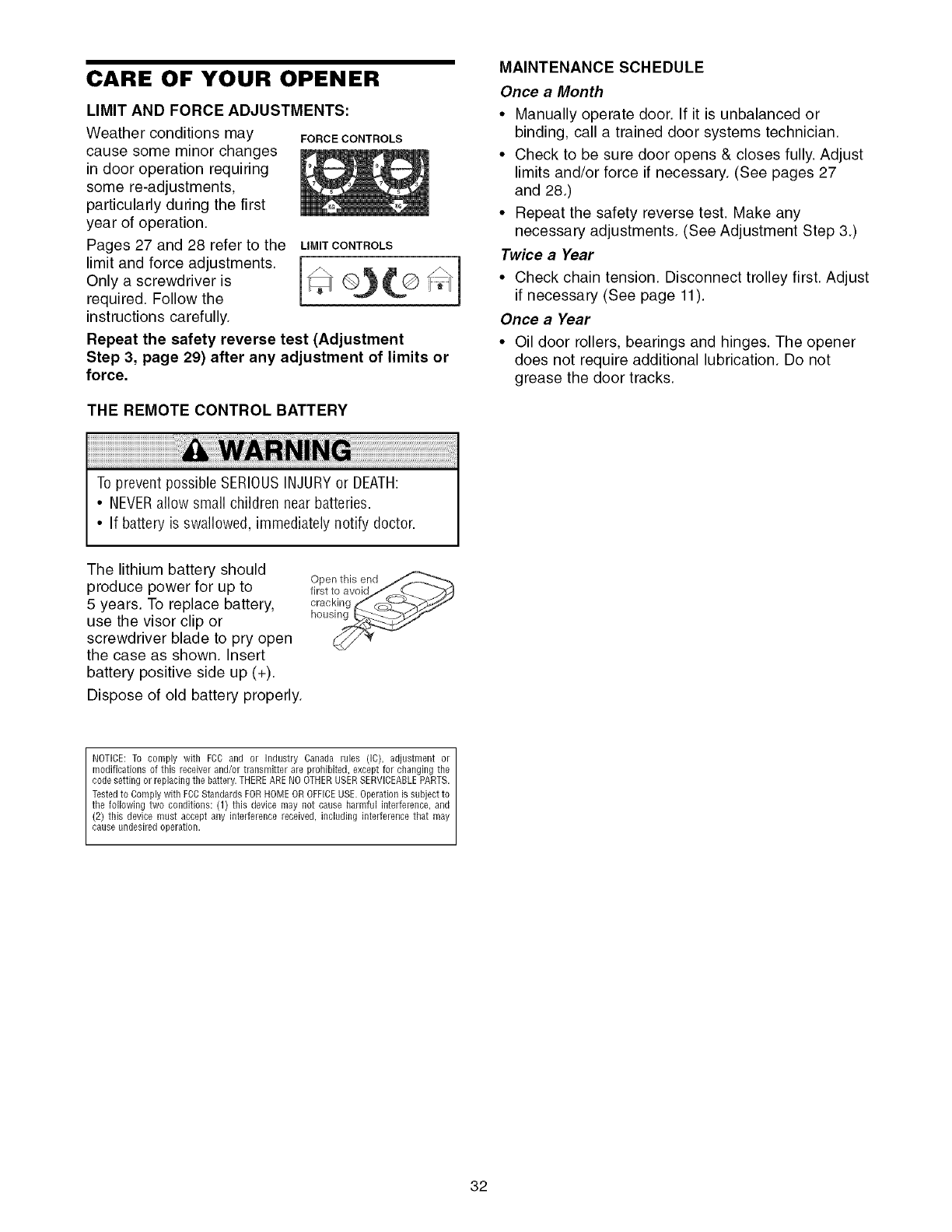 Care of your garage door opener .............................. 32