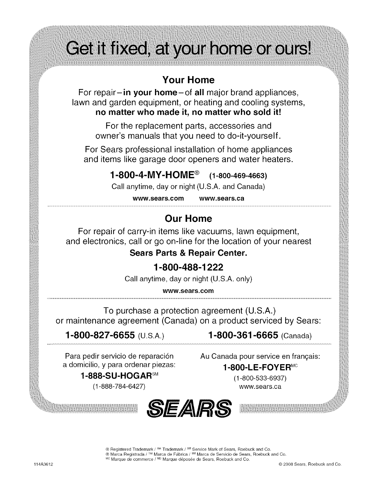 ® Registered Trademark /TiVlTrademark /SMService Mark of Sears, Roebuck and Co.