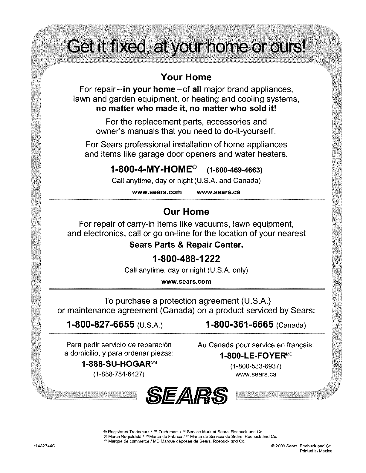 ® Marca Registrada /TMMarca de F&brica /_'_Marca de Servicio de Sears, Roebuck and Co.