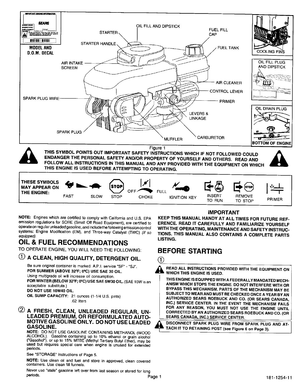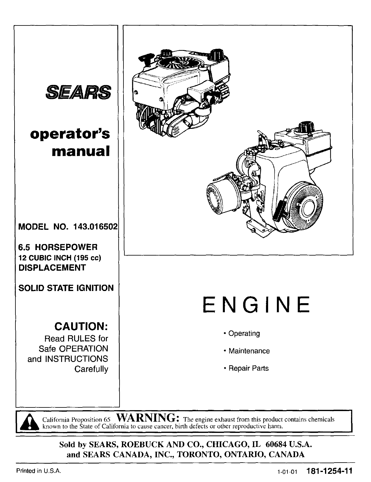CRAFTSMAN Engine Manual L0102273 CRAFTSMAN Engine Owner's Manual, CRAFTSMAN Engine installation guides