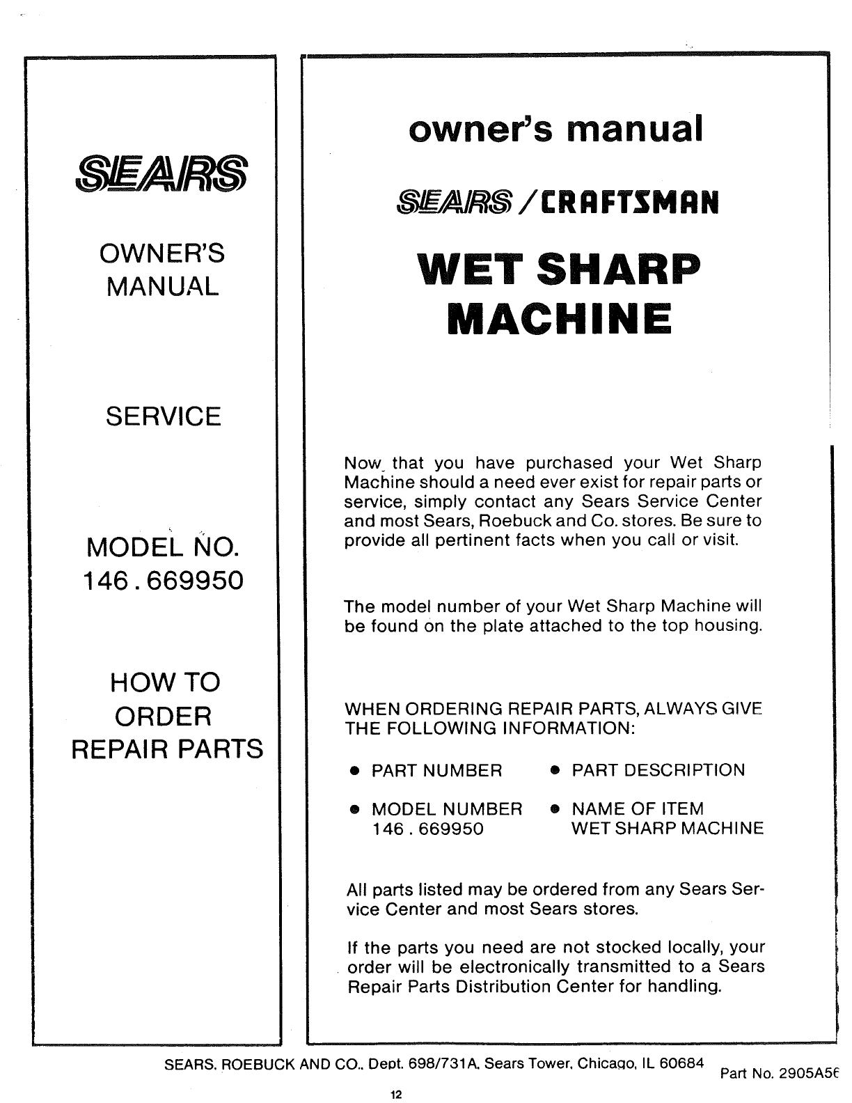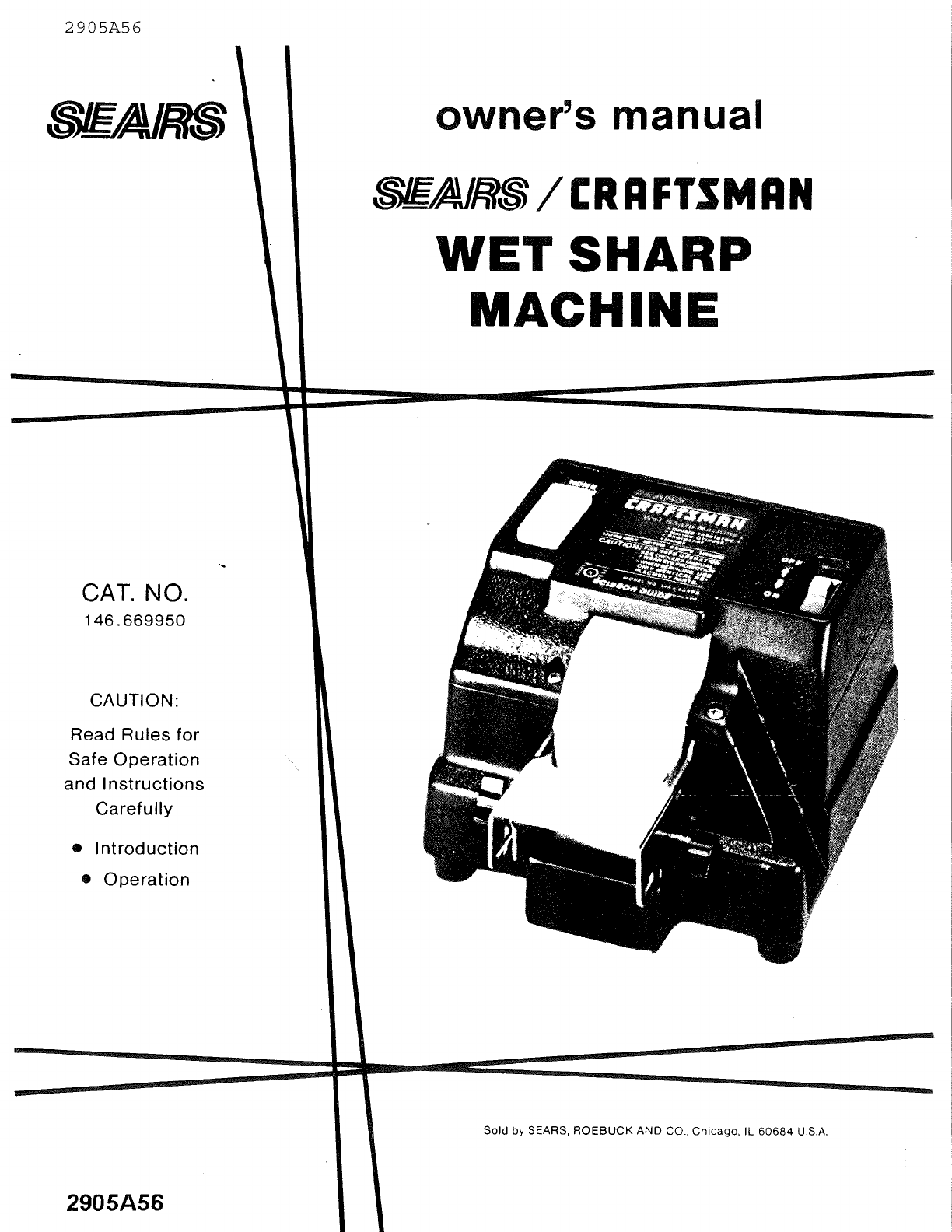 User Manual: Craftsman 146669950 146669950 CRAFTSMAN WET SHARP MACHINE - Manuals and Guides View the owners manual for your CRAFTSMAN WET SHARP MACHINE #146669950. Home:Tool Parts:Craftsman Parts:Craftsman WET SHARP MACHINE Manual