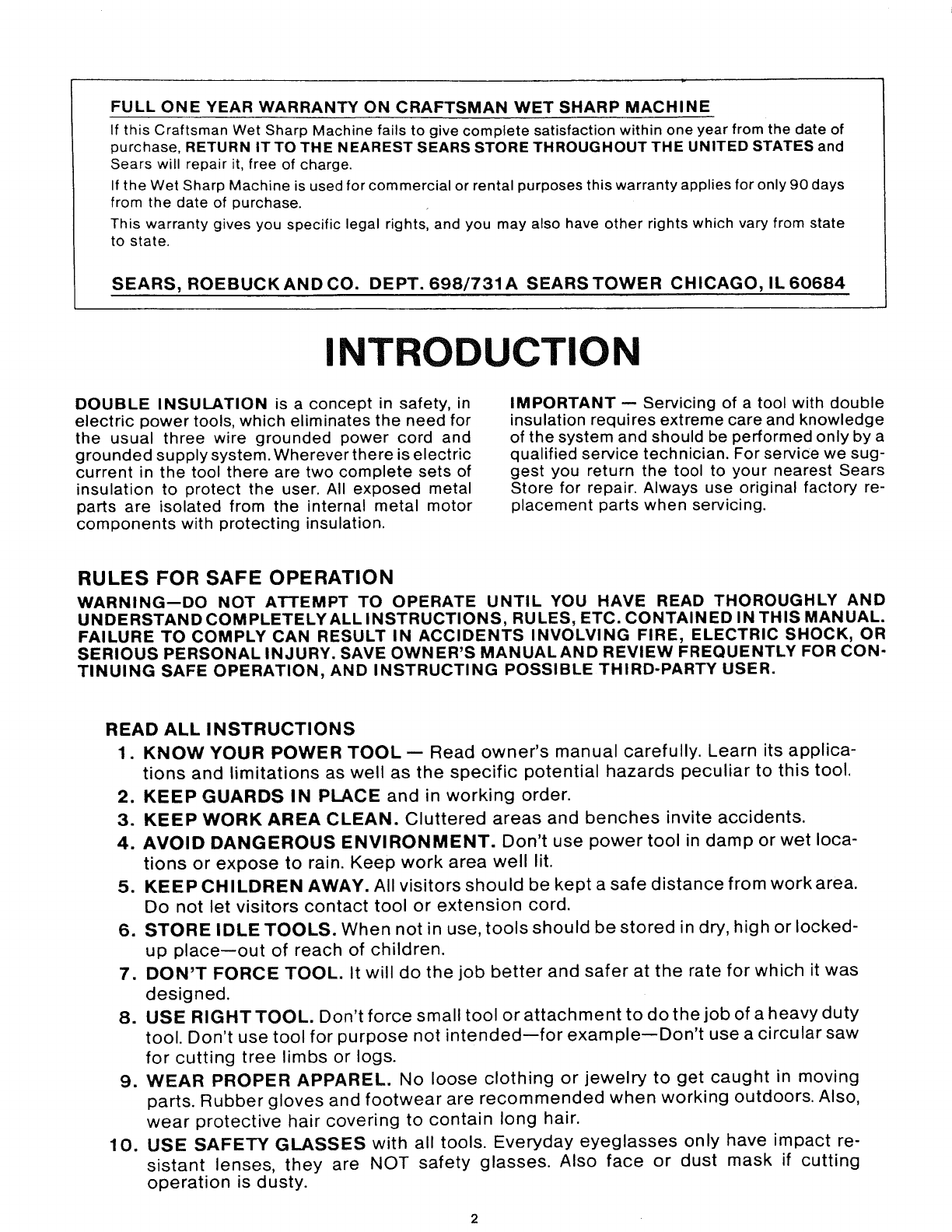 FULL ONE YEAR WARRANTY ON CRAFTSMAN WET SHARP MACHINE