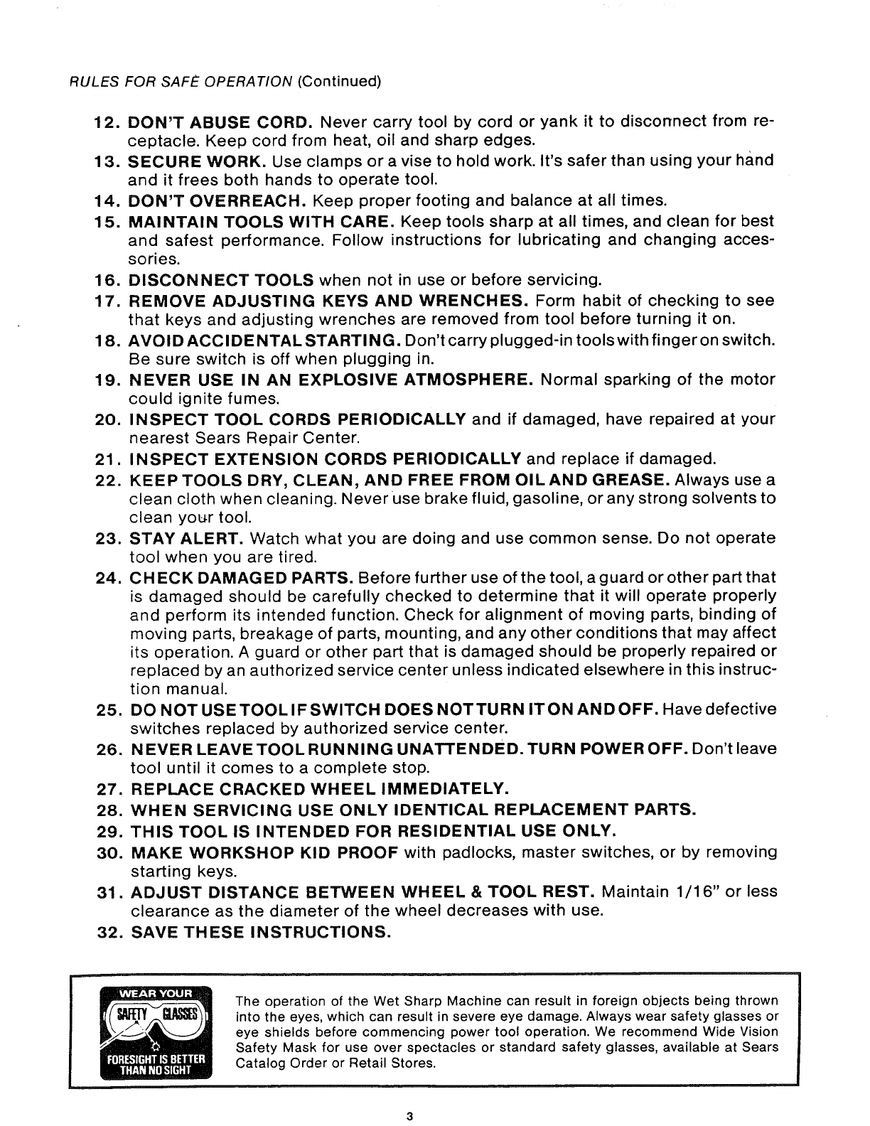 10. USE SAFETY GLASSES with all tools. Everyday eyeglasses only have impact re-
