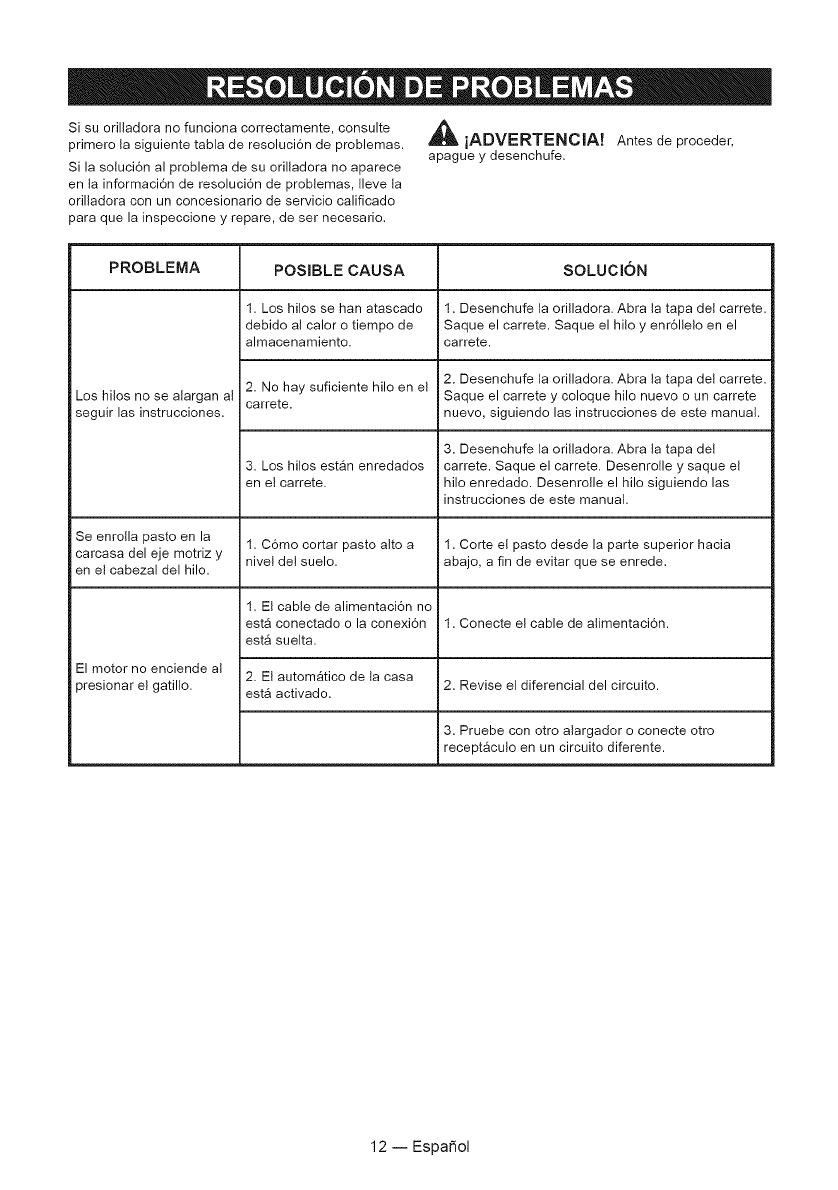 1. Los hilos se han atascado 1. Desenchufe ta orilladora. Abra ta tapa del carrete.