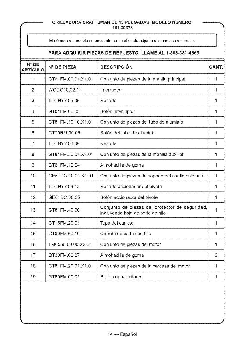 PARA ADQUIRIR PIEZAS DE REPUESTO, LLAME AL 1-888-331-4569