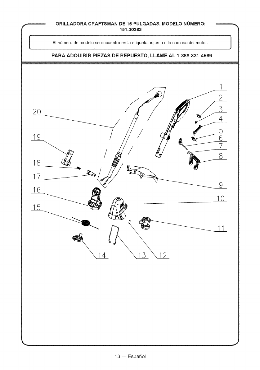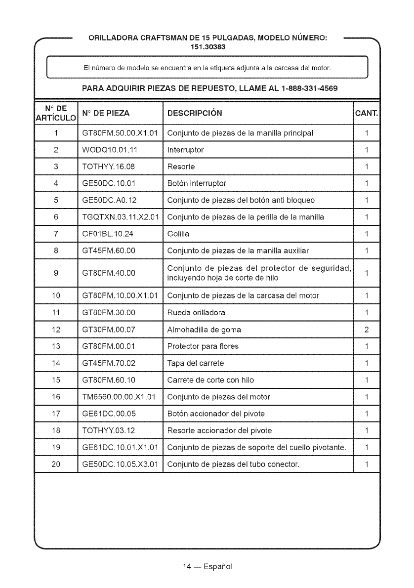 PARA ADQUIRIR PIEZAS DE REPUESTO, LLAME AL 1-888-331-4569