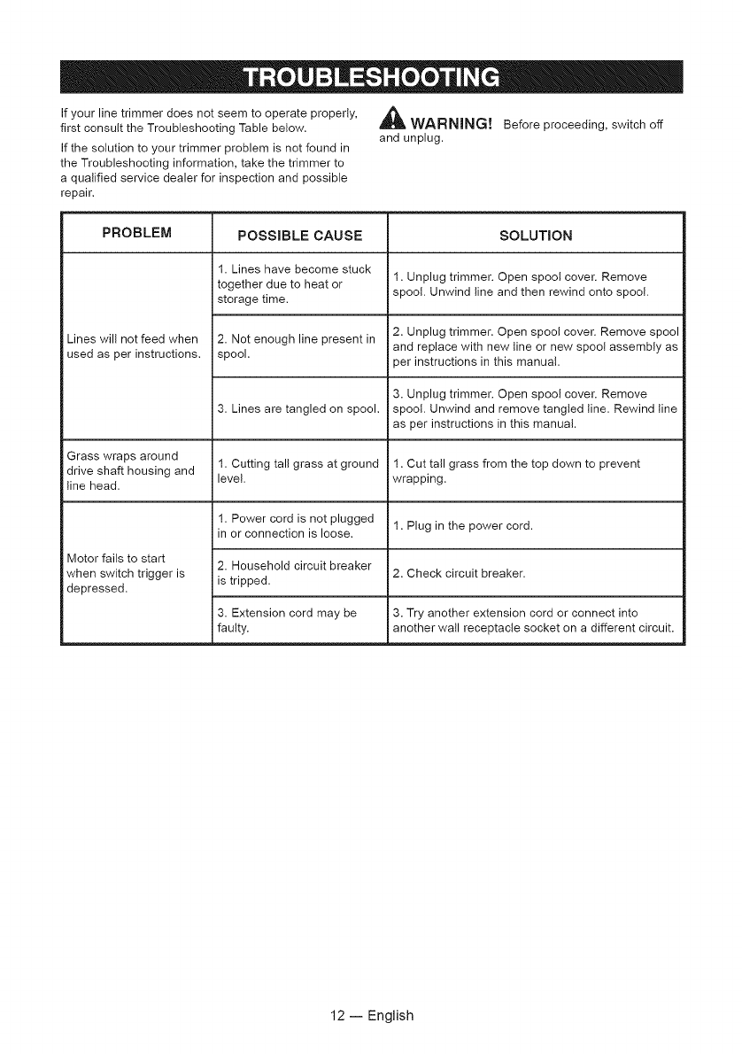 1. Los hilos se han atascado 1. Desenchufe ta orilladora. Abra ta tapa del carrete.