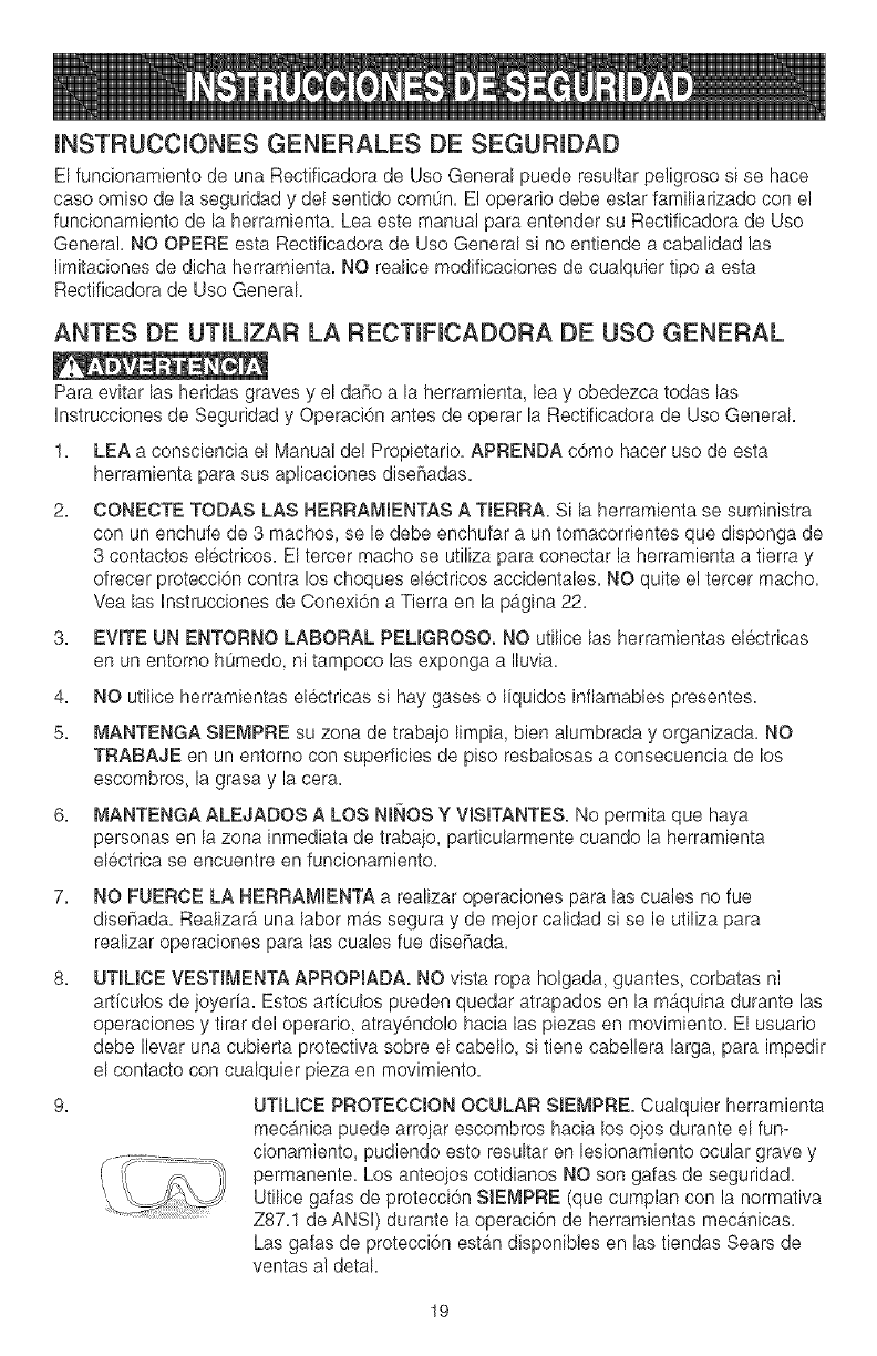 ANSi standard Z87.1) when operating power tools. Safety Goggles