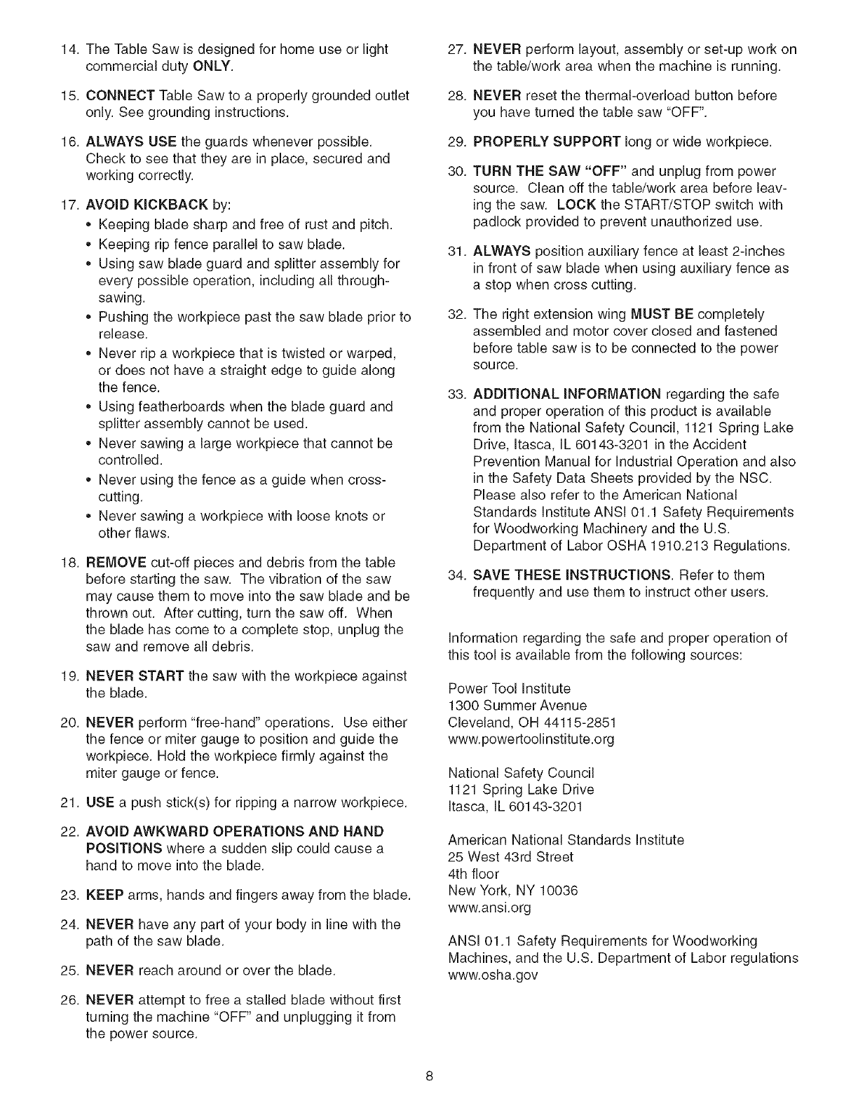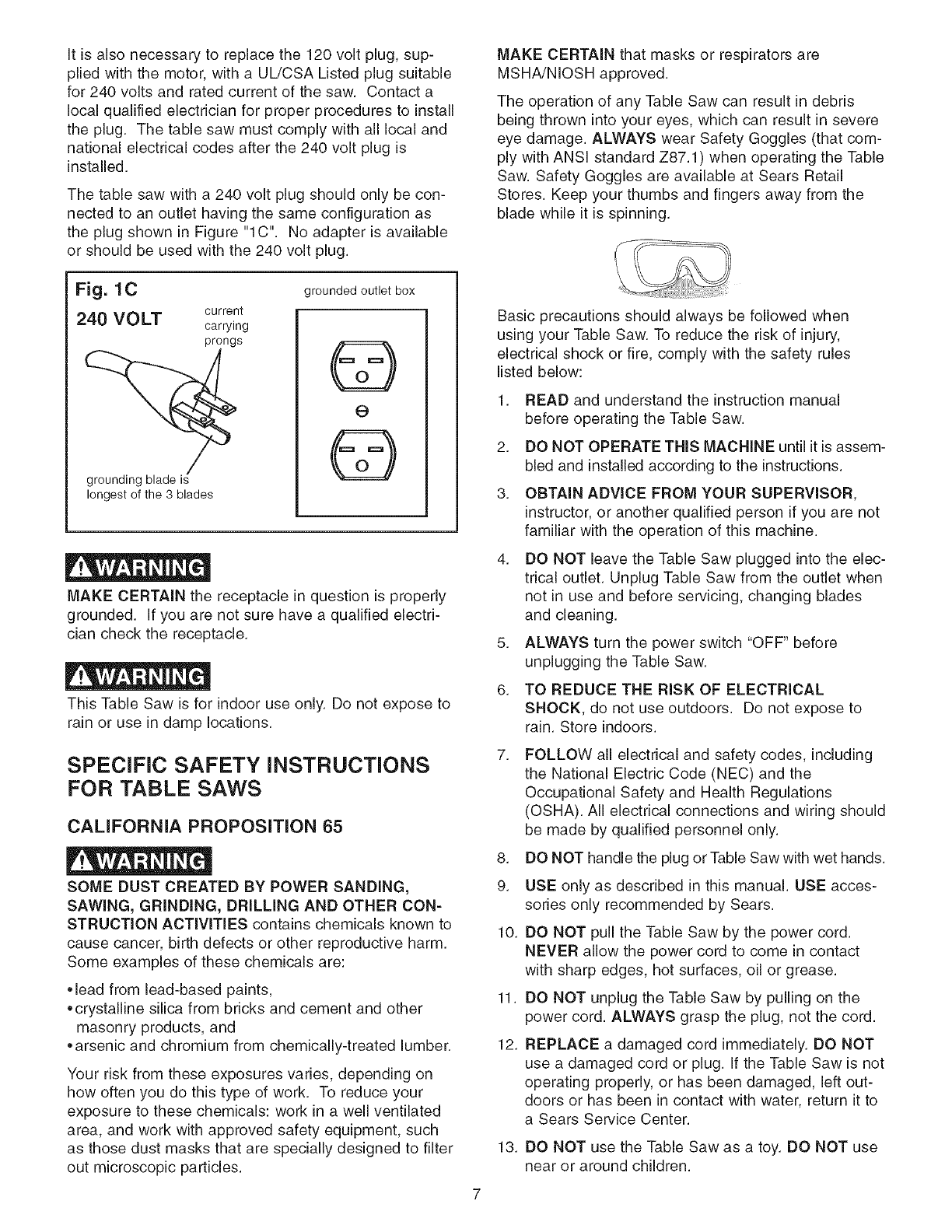 Specific Safety instructions for Table Saw .................................................................................................................. 7