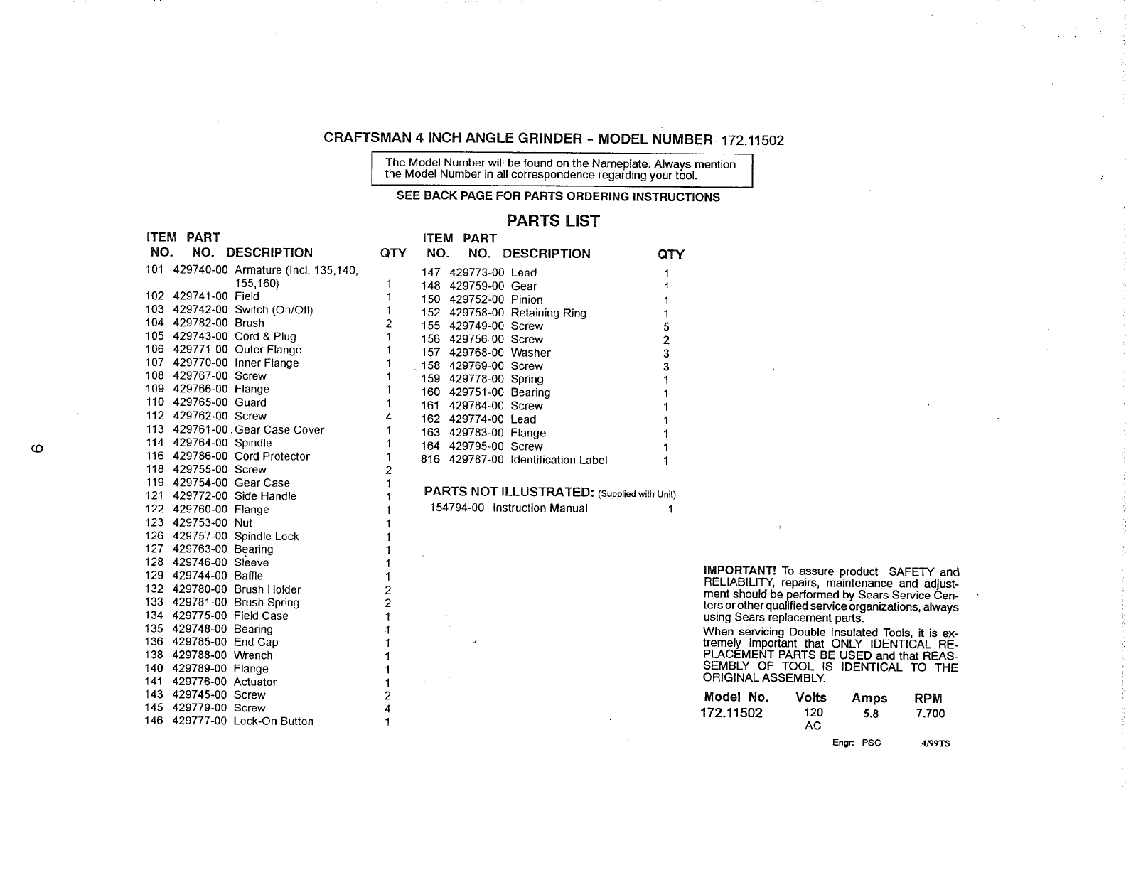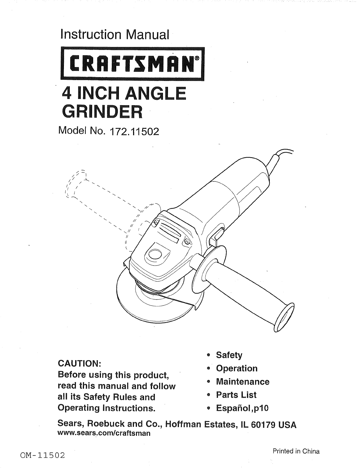 User Manual: Craftsman 17211502 17211502 CRAFTSMAN GRINDER - Manuals and Guides View the owners manual for your CRAFTSMAN GRINDER #17211502. Home:Tool Parts:Craftsman Parts:Craftsman GRINDER Manual