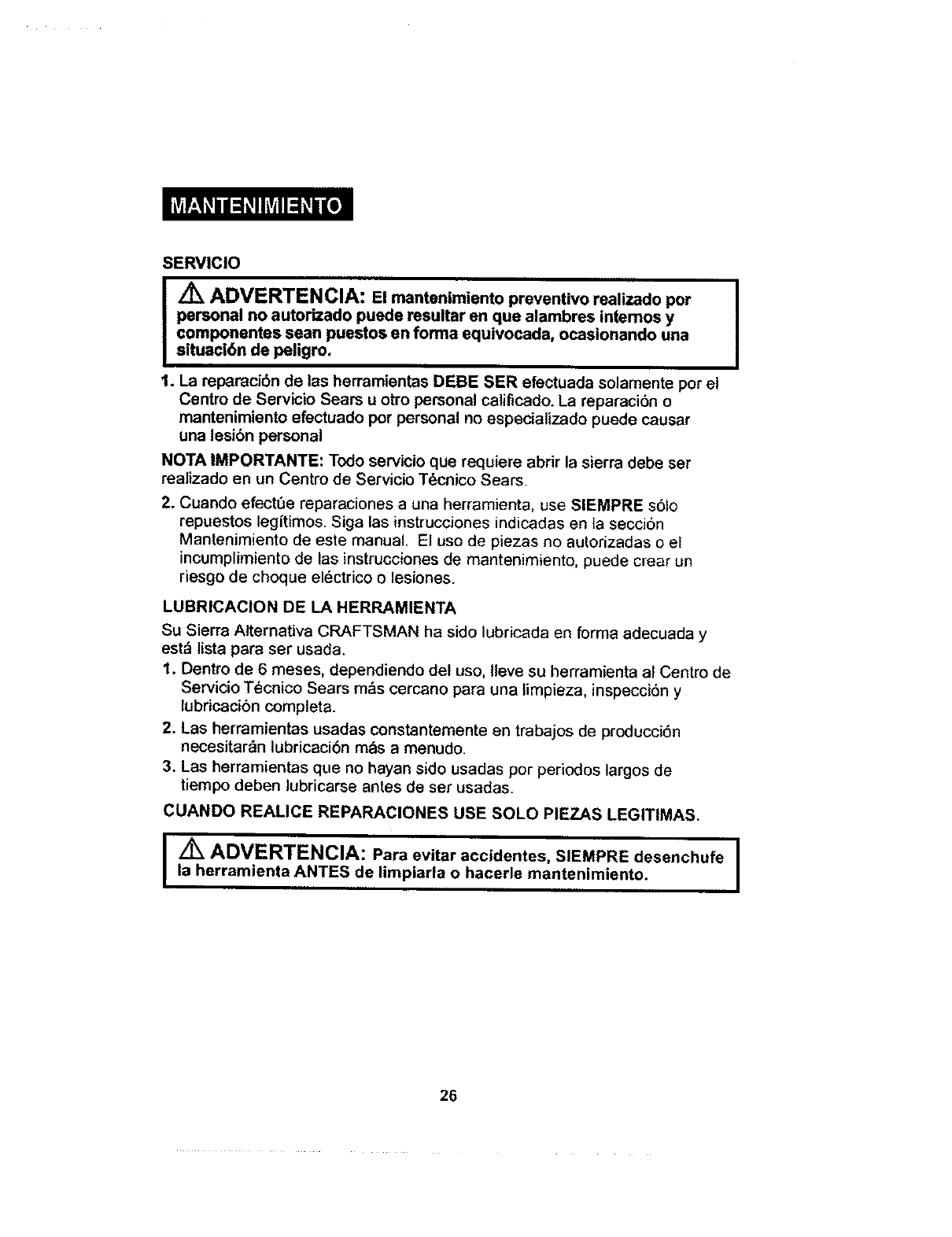 mantenimiento y ajustes deben ser realizados en el Centro de Servicio