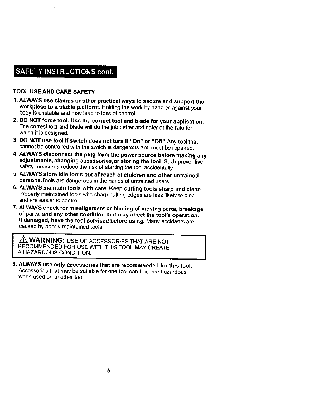 4. ALWAYS remove adjusting keys or wrenches before turning the tool on.