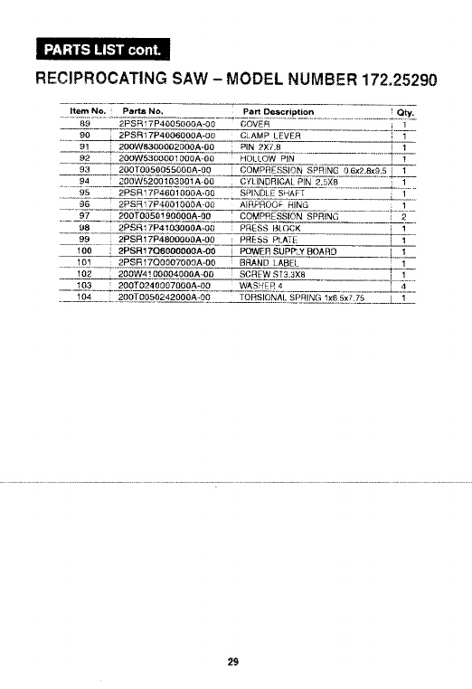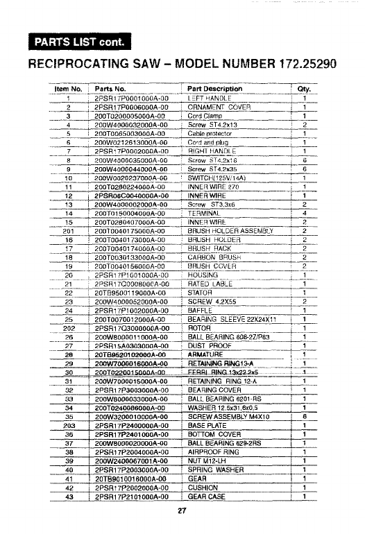 User Manual: Craftsman 17225290 17225290 CRAFTSMAN RECIPROCATING SAW - Manuals and Guides View the owners manual for your CRAFTSMAN RECIPROCATING SAW #17225290. Home:Tool Parts:Craftsman Parts:Craftsman RECIPROCATING SAW Manual